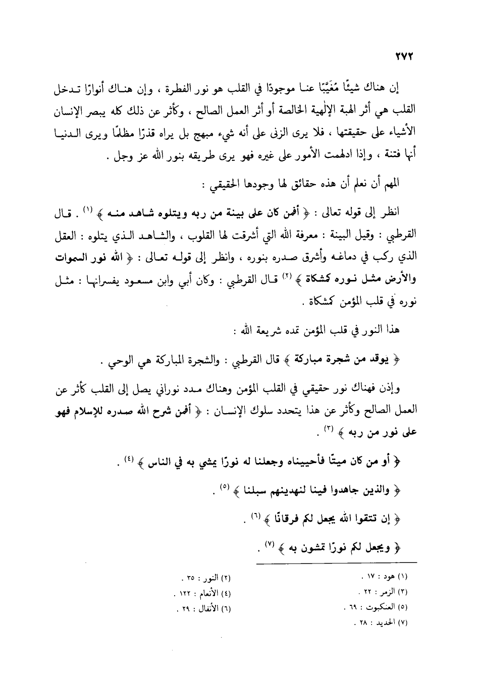 انظر إلى قوله تعالى: {أَفَمَنْ كَانَ عَلَى بَيِّنَةٍ مِنْ رَبِّهِ وَيَتْلُوهُ شَاهِدٌ مِنْهُ} (1). قال القرطبي: وقيل البينة: معرفة الله التي أشرقت لها القلوب، والشاهد الذي يتلوه: العقل الذي ركب في دماغه وأشرق صدره بنوره، وانظر إلى قوله تعالى: {اللَّهُ نُورُ السَّمَاوَاتِ وَالْأَرْضِ مَثَلُ نُورِهِ كَمِشْكَاةٍ} (2) قال القرطبي: وكان أبي وابن مسعود يفسرانها: مثل نوره في قلب المؤمن كمشكاة.