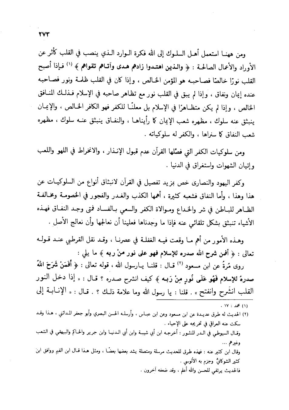 ومن ههنا استعمل أهل السلوك إلى الله فكرة الوارد الذي ينصب في القلب كأثر عن الأوراد والأعمال الصالحة: {وَالَّذِينَ اهْتَدَوْا زَادَهُمْ هُدًى وَآتَاهُمْ تَقْوَاهُمْ} (1) فإذا أصبح القلب نورًا خالصًا فصاحبه هو المؤمن الخالص، وإذا كان في القلب ظلمة ونور فصاحبه عنده إيمان ونفاق، وإذا لم يبق في القلب نور مع تظاهر صاحبه في الإسلام فذلك المنافق الخالص، وإذا لم يكن متظاهرًا في الإسلام بل معلنًا للكفر فهو الكافر الخالص، والإيمان ينبثق عنه السلوك، مظهره شعب الإيمان كما رأيناها، والنفاق ينبثق عنه سلوك، مظهره شعب النفاق كما سنراها، والكفر له سلوكياته.