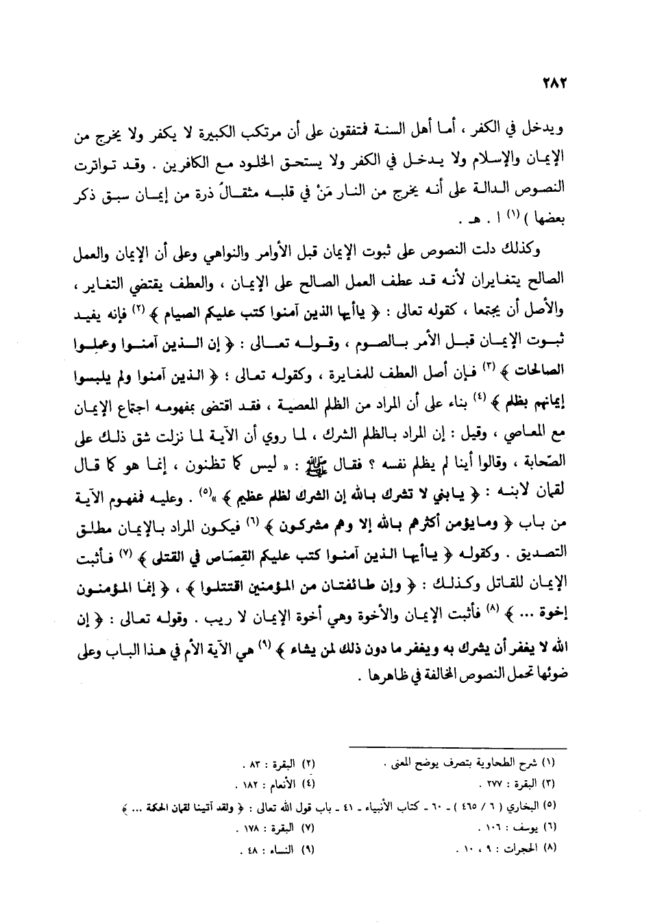 وكذلك دلت النصوص على ثبوت الإيمان قبل الأوامر والنواهي وعلى أن الإيمان والعمل الصالح يتغايران لأنه قد عطف العمل الصالح على الإيمان، والعطف يقتضي التغاير، والأصل أن يجتمعا، كقوله تعالى: {يَاأَيُّهَا الَّذِينَ آمَنُوا كُتِبَ عَلَيْكُمُ الصِّيَامُ} (2) فإنه يفيد ثبوت الإيمان قبل الأمر بالصوم، وقوله تعالى: {إِنَّ الَّذِينَ آمَنُوا وَعَمِلُوا الصَّالِحَاتِ} (3) فإن أصل العطف للمغايرة، وكقوله تعالى: {الَّذِينَ آمَنُوا وَلَمْ يَلْبِسُوا إِيمَانَهُمْ بِظُلْمٍ} (4) بناء على أن المراد من الظلم المعصية، فقد اقتضى بمفهومه اجتماع الإيمان مع المعاصي، وقيل: إن المراد بالظلم الشرك، لما روي أن الآية لما نزلت شق ذلك على الصحابة، وقالوا أينا لم يظلم نفسه؟ فقال صلى الله عليه وسلم: "ليس كما تظنون، إنما هو كما قال لقمان لابنه: {يَابُنَيَّ لَا تُشْرِكْ بِاللَّهِ إِنَّ الشِّرْكَ لَظُلْمٌ عَظِيمٌ} (5). وعليه فمفهوم الآية من باب {وَمَا يُؤْمِنُ أَكْثَرُهُمْ بِاللَّهِ إِلَّا وَهُمْ مُشْرِكُونَ} (6) فيكون المراد بالإيمان مطلق التصديق. وكقوله {يَاأَيُّهَا الَّذِينَ آمَنُوا كُتِبَ عَلَيْكُمُ الْقِصَاصُ فِي الْقَتْلَى} (7) فأثبت الإيمان للقاتل وكذلك: {وَإِنْ طَائِفَتَانِ مِنَ الْمُؤْمِنِينَ اقْتَتَلُوا}، {إِنَّمَا الْمُؤْمِنُونَ إِخْوَةٌ ...} (8) فأثبت الإيمان والأخوة وهي أخوة الإيمان لا ريب. وقوله تعالى: {إِنَّ اللَّهَ لَا يَغْفِرُ أَنْ يُشْرَكَ بِهِ وَيَغْفِرُ مَا دُونَ ذَلِكَ لِمَنْ يَشَاءُ} (9) هي الآية الأم في هذا الباب وعلى ضوئها تحمل النصوص المخالفة في ظاهرها.