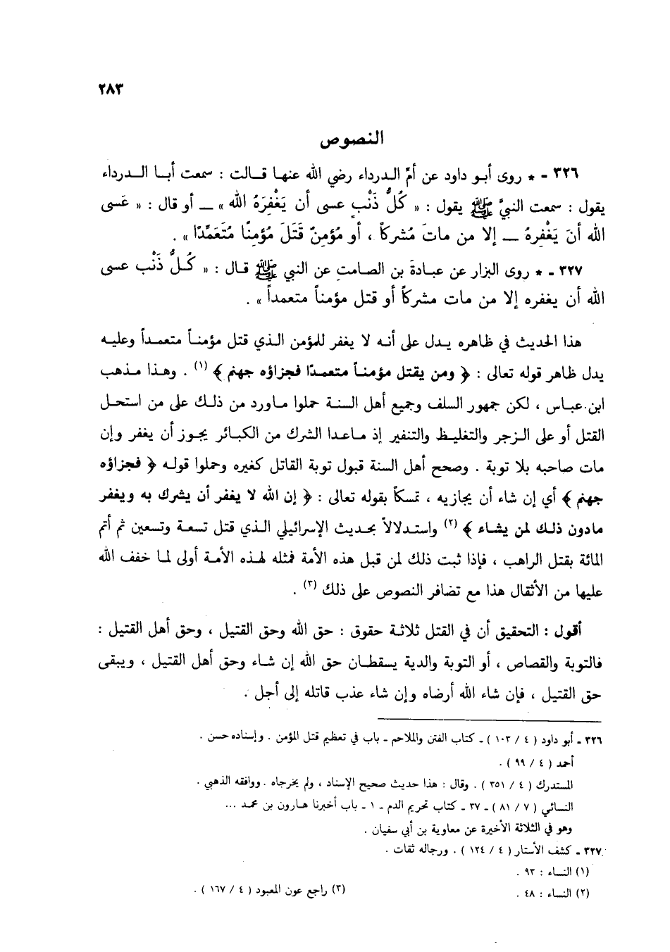 326 - * روى أبو داود عن أم الدرداء رضي الله عنها قالت: سمعت أبا الدرداء يقول: سمعت النبي صلى الله عليه وسلم يقول: "كل ذنبٍ عسى أن يغفره الله" -أو قال: "عسى الله أن يغفره- إلا من مات مشركًا، أو مؤمن قتل مؤمنا متعمدًا".