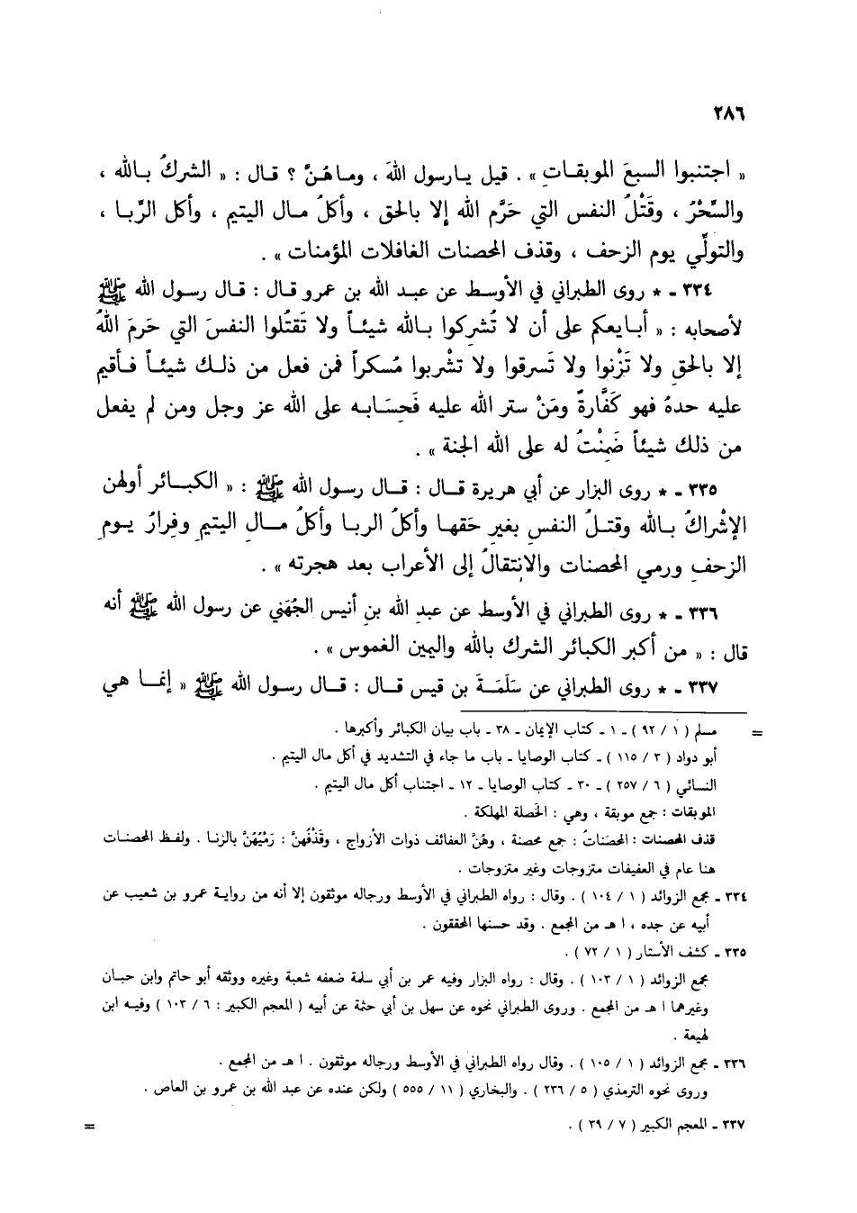 335 - * روى البزار عن أبي هريرة قال: قال رسول الله صلى الله عليه وسلم: "الكبائر أولهن الإشراك بالله وقتل النفس بغير حقها وأكل الربا وأكل مال اليتيم وفرار يوم الزحف ورمي المحصنات والانتقال إلى الأعراب بعد هجرته".