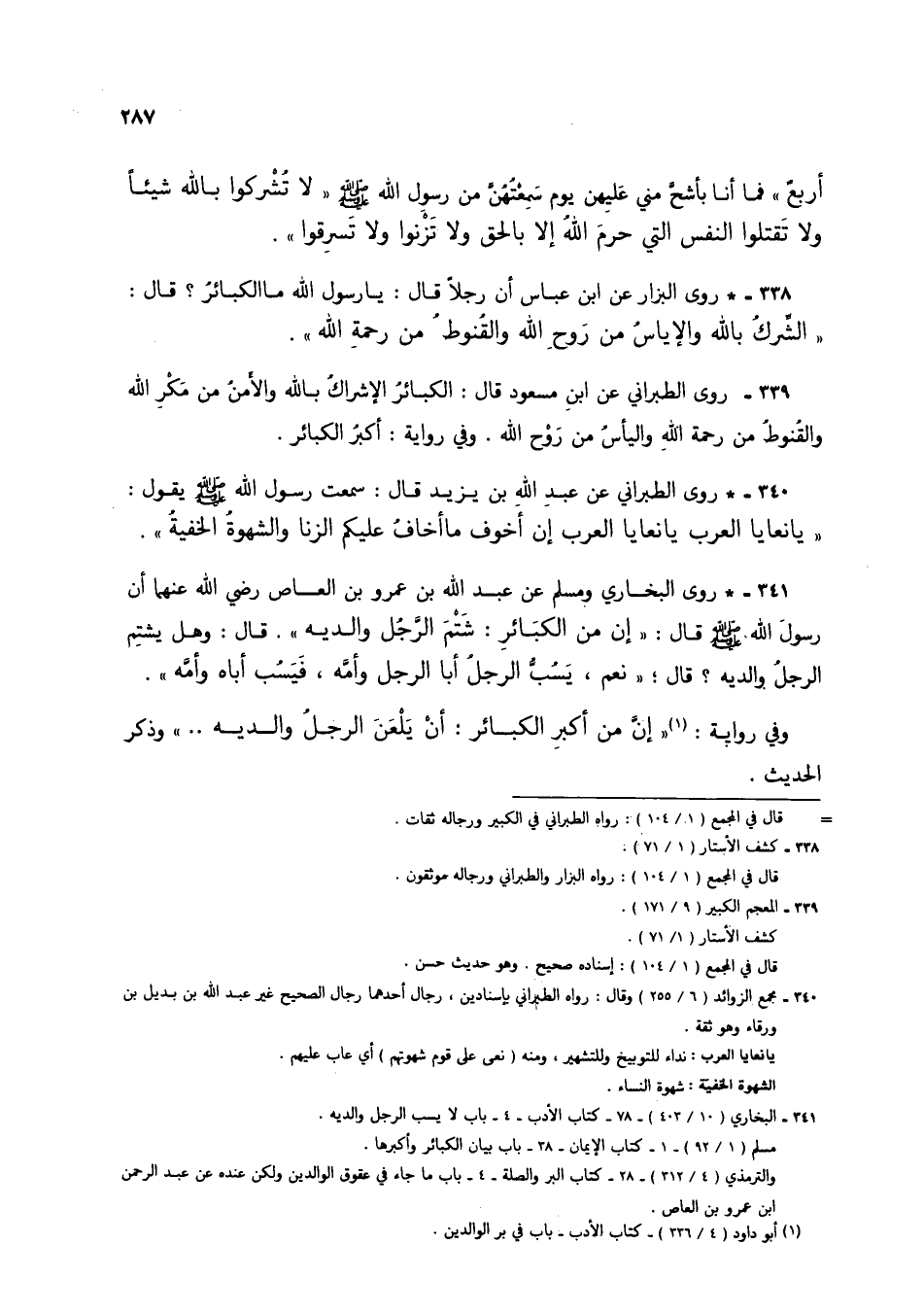 338 - * روى البزار عن ابن عباس أن رجلاً قال: يا رسول الله ما الكبائر؟ قال: "الشرك بالله والإياس من روح الله والقنوط من رحمة الله".