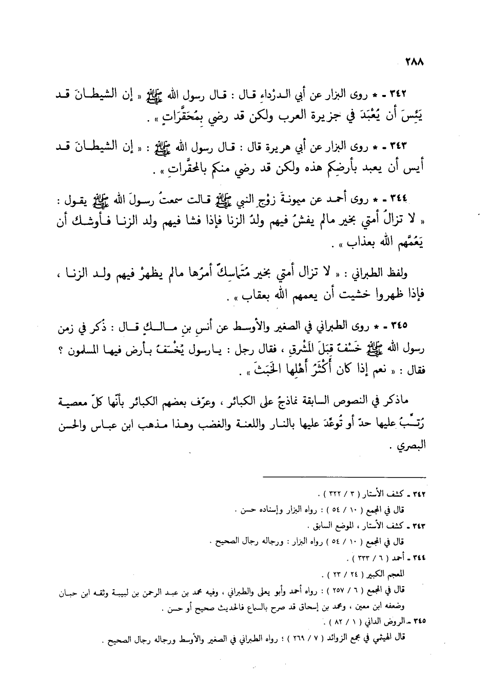 342 - * روى البزار عن أبي الدرداء قال: قال رسول الله صلى الله عليه وسلم "إن الشيطان قد يئس أن يعبد في جزيرة العرب ولكن قد رضي بمحقراتٍ".