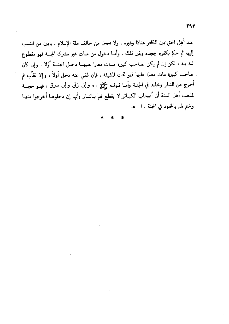 عند أهل الحق بين الكافر عنادًا وغيره، ولا بين من خالف ملة الإسلام، وبين من انتسب إليها ثم حكم بكفره بجحده وغير ذلك. وأما دخول من مات غير مشرك الجنة فهو مقطوع له به، لكن إن لم يكن صاحب كبيرة مات مصرا عليها دخل الجنة أولا. وإن كان صاحب كبيرة مات مصرًا عليها فهو تحت المشيئة، فإن عفي عنه دخل أولاً، وإلا عذب ثم أخرج من النار وخلد في الجنة وأما قوله صلى الله عليه وسلم: "وإن زنى وإن سرق" فهو حجة لمذهب أهل السنة أن أصحاب الكبائر لا يقطع لهم بالنار وأنهم إن دخلوها أخرجوا منها وختم لم بالخلود في الجنة. ا. هـ.
