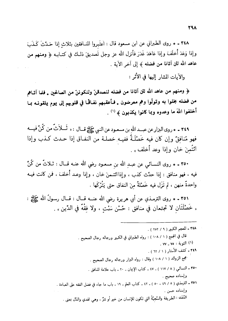 348 - * روى الطبراني عن ابن مسعود قال: اعتبروا المنافقين بثلاث إذا حدث كذب وإذا وعد أخلف وإذا عاهد غدر فأنزل الله عز وجل تصديق ذلك في كتابه {وَمِنْهُمْ مَنْ عَاهَدَ اللَّهَ لَئِنْ آتَانَا مِنْ فَضْلِهِ} إلى آخر الآية.