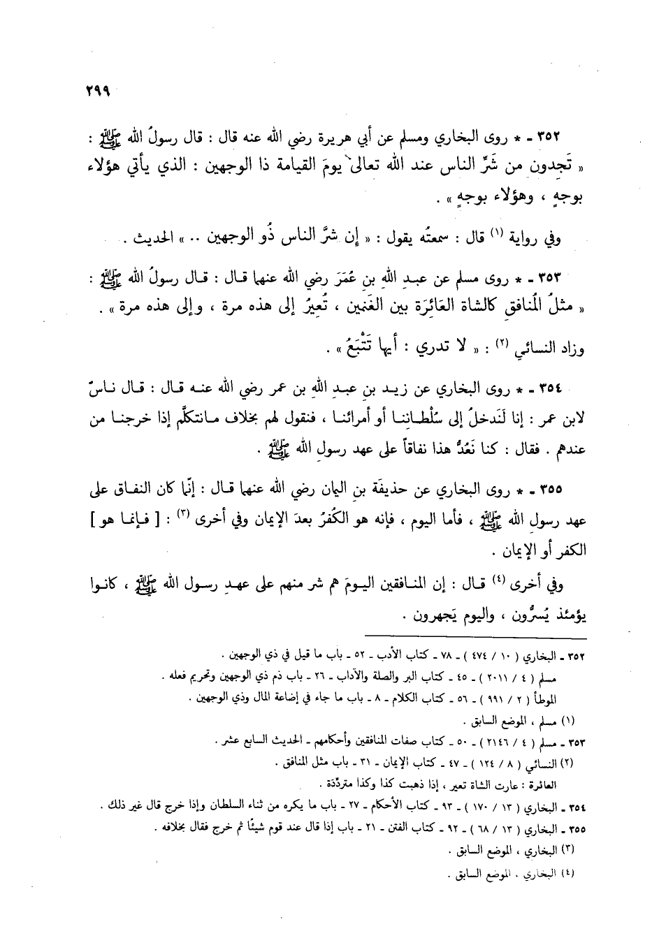 352 - * روى البخاري ومسلم عن أبي هريرة رضي الله عنه قال: قال رسول الله صلى الله عليه وسلم: "تجدون من شر الناس عند الله تعالى يوم القيامة ذا الوجهين: الذي يأتي هؤلاء بوجهٍ، وهؤلاء بوجهٍ".