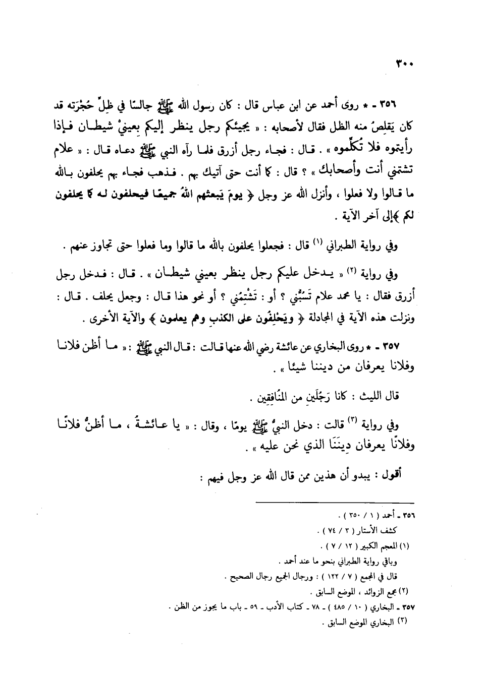 356 - * روى أحمد عن ابن عباس قال: كان رسول الله صلى الله عليه وسلم جالسًا في ظل حجرته قد كان يقلص منه الظل فقال لأصحابه: "يجيئكم رجل ينظر إليكم بعيني شيطان فإذا رأيتموه فلا تكلموه". قال: فجاء رجل أزرق فلما رآه النبي صلى الله عليه وسلم دعاه قال: "علام تشتمني أنت وأصحابك"؟ قال: كما أنت حتى آتيك بهم. فذهب فجاء بهم يحلفون بالله ما قالوا ولا فعلوا، وأنزل الله عز وجل {يَوْمَ يَبْعَثُهُمُ اللَّهُ جَمِيعًا فَيَحْلِفُونَ لَهُ كَمَا يَحْلِفُونَ لَكُمْ} إلى آخر الآية.