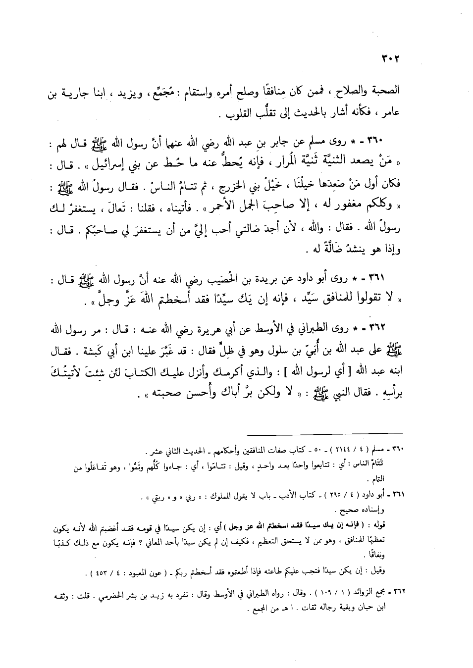 362 - * روى الطبراني في الأوسط عن أبي هريرة رضي الله عنه: قال: مر رسول الله صلى الله عليه وسلم على عبد الله بن أُبي بن سلول وهو في ظلٍّ فقال: قد غَبْرَ علينا ابن أبي كبشة. فقال ابنه عبد الله [أي لرسول الله]: والذي أكرمك وأنزل عليك الكتاب لئن شئت لأتيتك برأسه. فقال النبي صلى الله عليه وسلم: "لا ولكن برَّ أباك وأحسن صحبته".