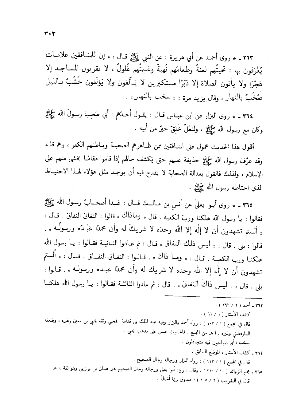 363 - * روى أحمد عن أبي هريرة: عن النبي صلى الله عليه وسلم قال: "إن للمنافقين علامات يُعرفون بها: تحيتُهم لعنةٌ وطعامهم نُهبةٌ وغنيمتهم غُلولٌ، لا يقربون المساجد إلا هجراً ولا يأتون الصلاة إلا دُبراً مستكبرين لا يألفون ولا يؤلفون خُشبٌ بالليل صُخبٌ بالنهار" وقال يزيد مرة: "سخب بالنهار".