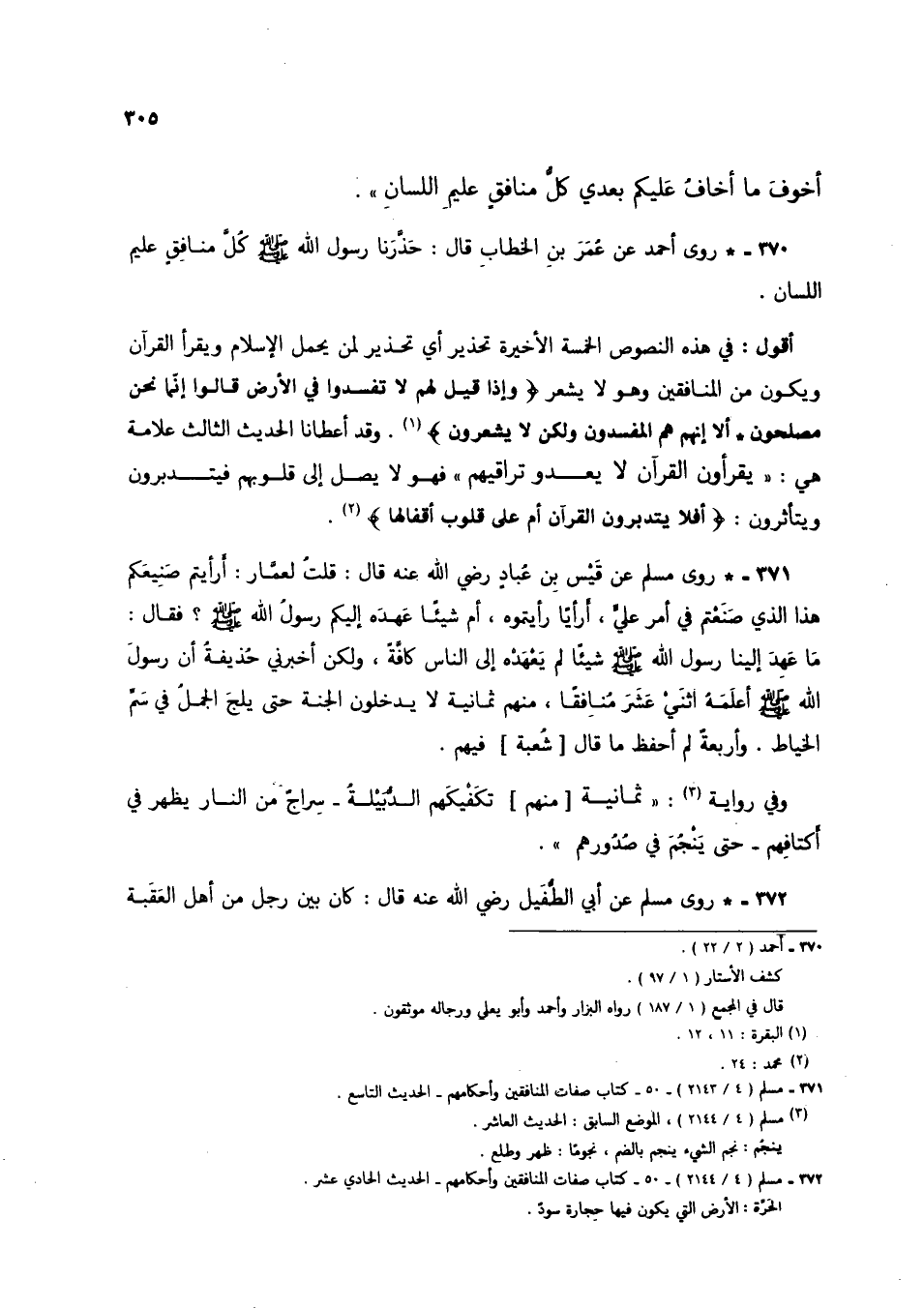 370 - * روى أحمد عن عمر بن الخطاب قال: حذرنا رسول الله صلى الله عليه وسلم كل منافقٍ عليم اللسان.