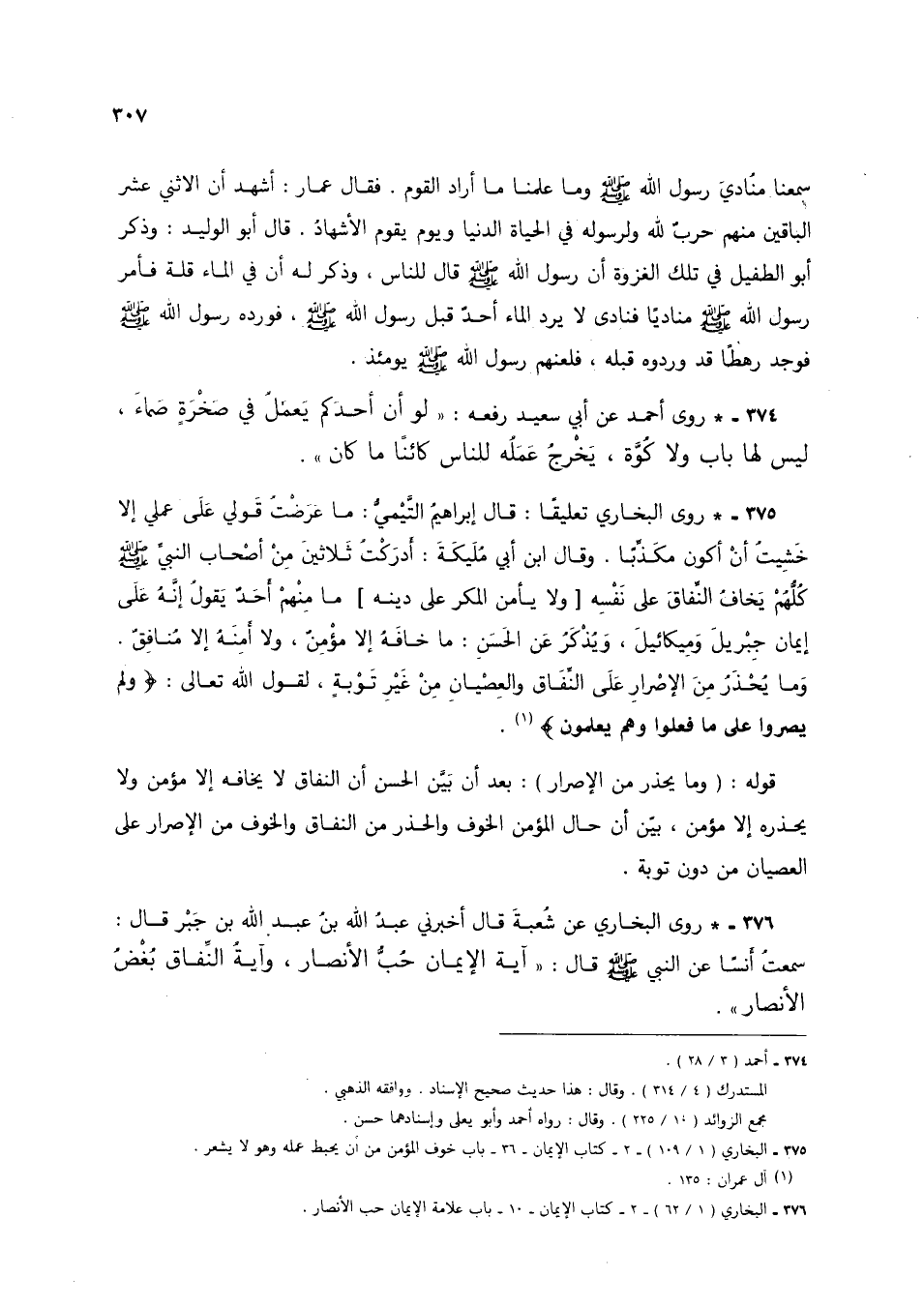 375 - * روى البخاري تعليقاً: قال إبراهيم التيمي: ما عرضت قولي على عملي إلا خشيتُ أن أكون مكذباً. وقال ابن أبي مُليكة: أدركت ثلاثين من أصحاب النبي صلى الله عليه وسلم كلهم يخافُ النفاق على نفسه [ولا يأمن المكر على دينه] ما منهم أحدٌ يقول إنه على إيمان جبريل وميكائيل، ويُذكر عن الحسن: ما خافهُ إلا مؤمنٌ، ولا أمنهُ إلا منافقٌ. وما يُحذرُ من الإصرار على النفاق والعصيان من غير توبةٍ، لقول الله تعالى: {وَلَمْ يُصِرُّوا عَلَى مَا فَعَلُوا وَهُمْ يَعْلَمُونَ} (1).
