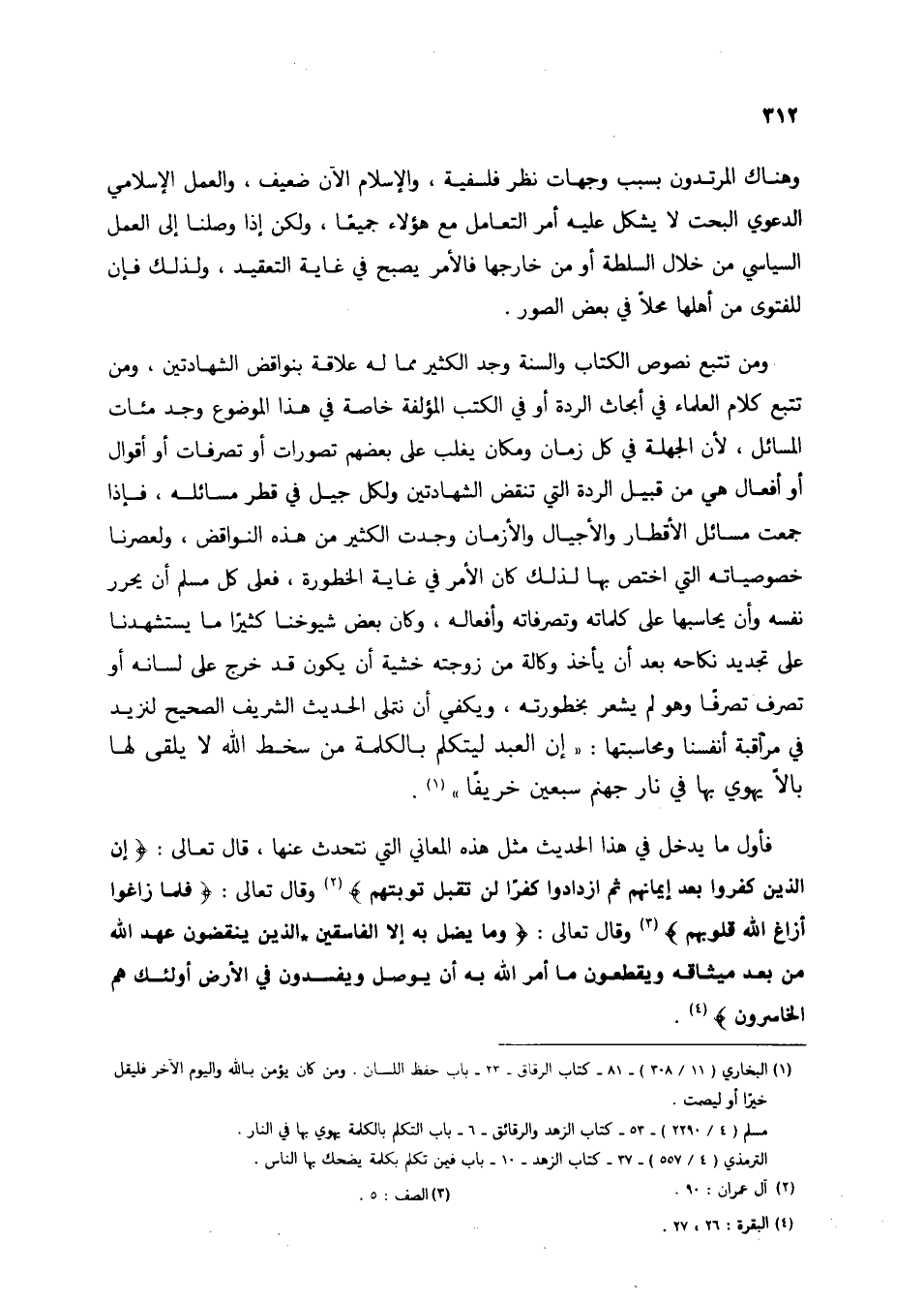 ومن تتبع نصوص الكتاب والسنة وجد الكثير مما له علاقة بنواقض الشهادتين، ومن تتبع كلام العلماء في أبحاث الردة أو في الكتب المؤلفة خاصة في هذا الموضوع وجد مئات المسائل، لأن الجهلة في كل زمان ومكان يغلب على بعضهم تصورات أو تصرفات أو أقوال أو أفعال هي من قبيل الردة التي تنقض الشهادتين ولكل جيل في قطر مسائله، فإذا جمعت مسائل الأقطار والأجيال والأزمان وجدت الكثير من هذه النواقض، ولعصرنا خصوصياته التي اختص بها لذلك كان الأمر في غاية الخطورة، فعلى كل مسلم أن يحرر نفسه وأن يحاسبها على كلماته وتصرفاته وأفعاله، وكان بعض شيوخنا كثيراً ما يستشهدنا على تجديد نكاحه بعد أن يأخذ وكالة من زوجته خشية أن يكون قد خرج على لسانه أو تصرف تصرفاً وهو لم يشعر بخطورته، ويكفي أن نتملى الحديث الشريف الصحيح لنزيد في مراقبة أنفسنا ومحاسبتها: "إن العبد ليتكلم بالكلمة من سخط الله لا يلقى لها بالاً يهوي بها في نار جهنم سبعين خريفاً" (1).