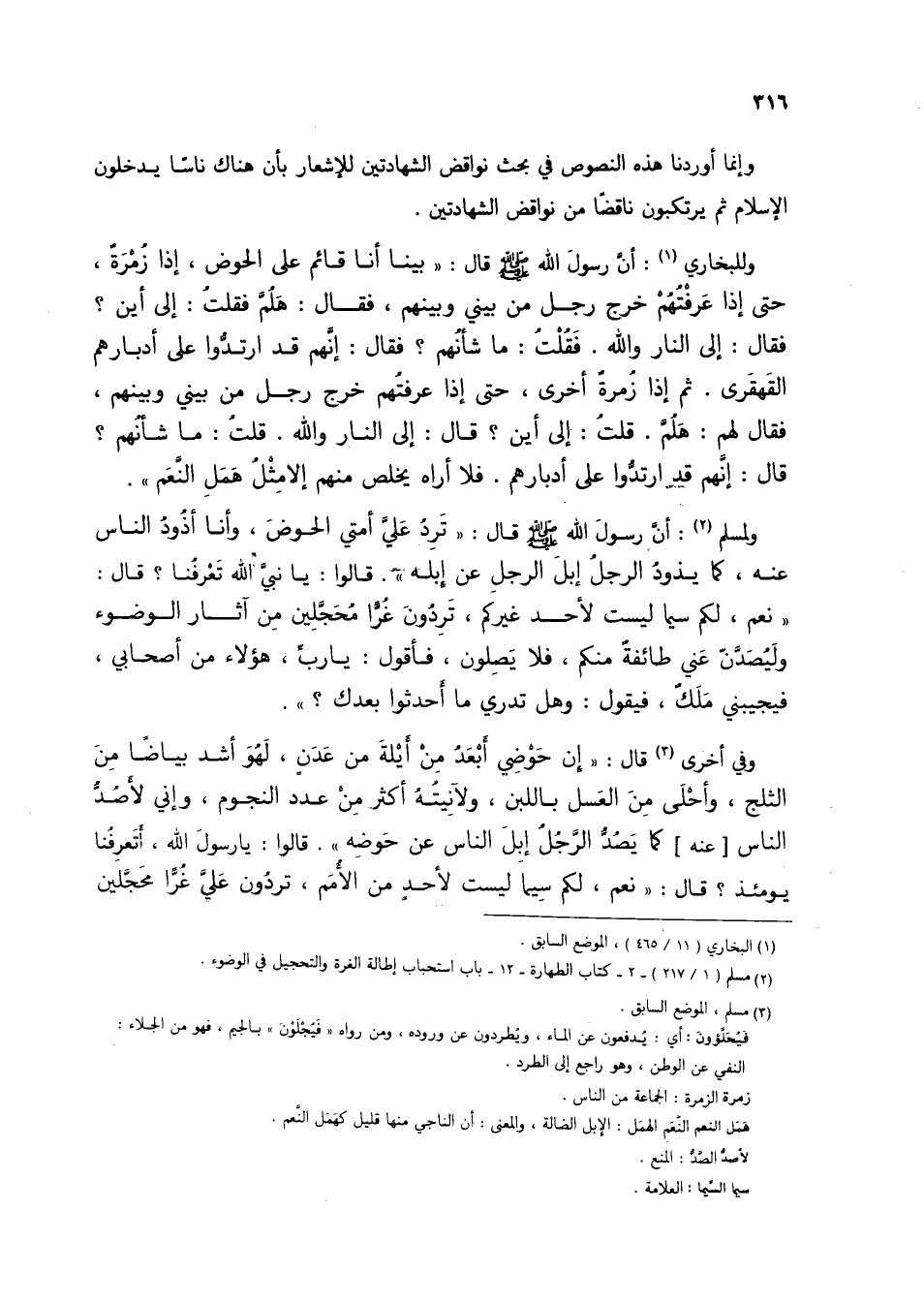 وللبخاري (1): أن رسول الله صلى الله عليه وسلم قال: "بينا أنا قائم على الحوض: إذا زُمرةً، حتى عرفتهم خرج رجل من بيني وبينهم، فقال: هلمَّ فقلتُ: إلى أين؟ فقال: إلى النار والله. فقلتُ: ما شأنُهم؟ فقال: إنهم قد ارتدوا على أدبارهم القهقري. ثم إذا زُمرةٌ أخرى، حتى إذا عرفتُهم خرج رجل من بيني وبينهم، فقال لهم: هلم. قلتُ: إلى أين؟ قال: إلى النار والله. قلتُ: ما شأنُهم؟ قال: إنهم قد ارتدوا على أدبارهم. فلا أراه يخلص منهم إلا مثل همل النعم".