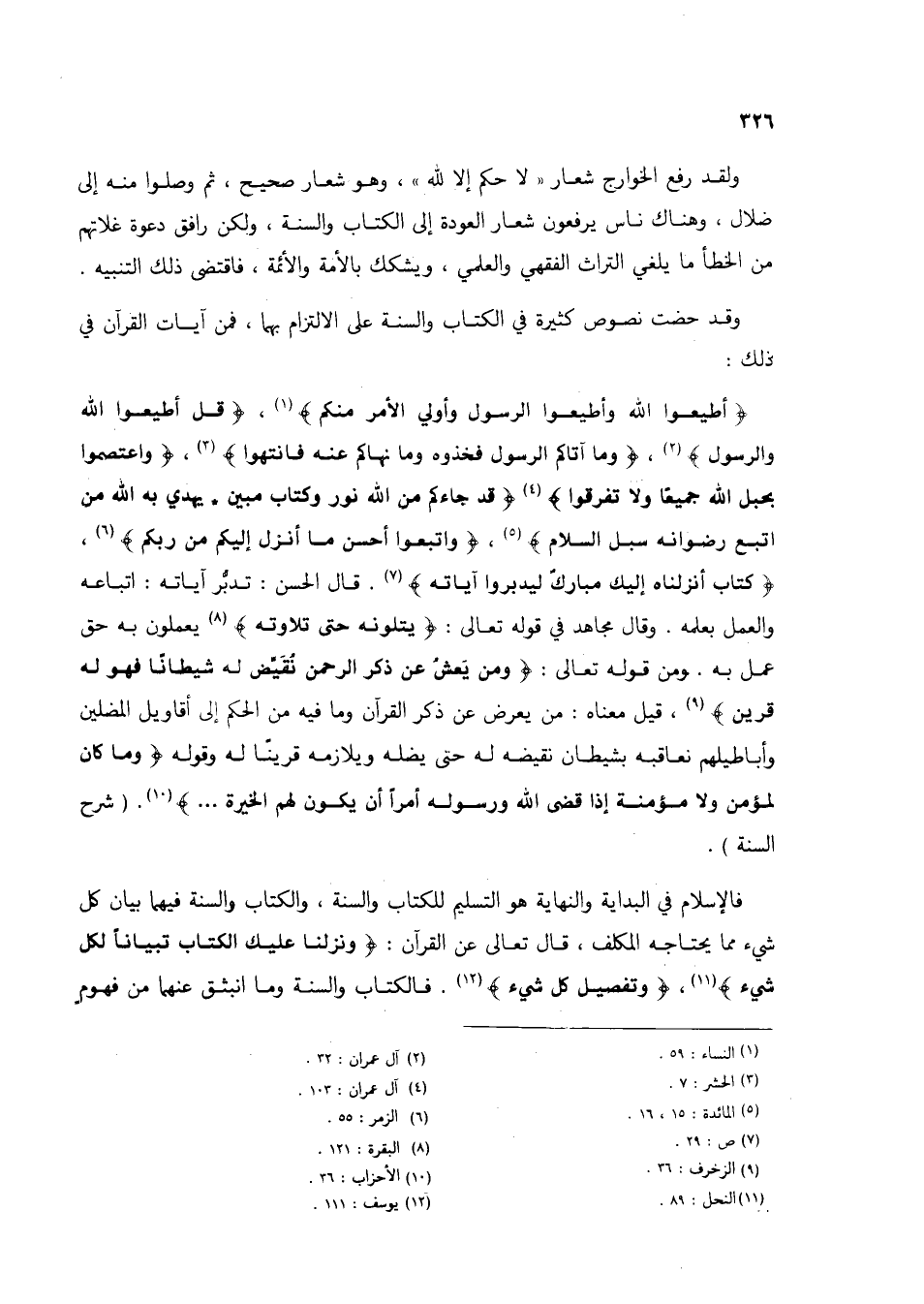 ولقد رفع الخوارج شعار "لا حكم إلا لله"، وهو شعار صحيح، ثم وصلوا منه إلى ضلال، وهناك ناس يرفعون شعار العودة إلى الكتاب والسنة، ولكن رافق دعوة غلاتهم من الخطأ ما يلغي التراث الفقهي والعلمي، ويشكك بالأمة والأئمة، فاقتضى ذلك التنبيه.