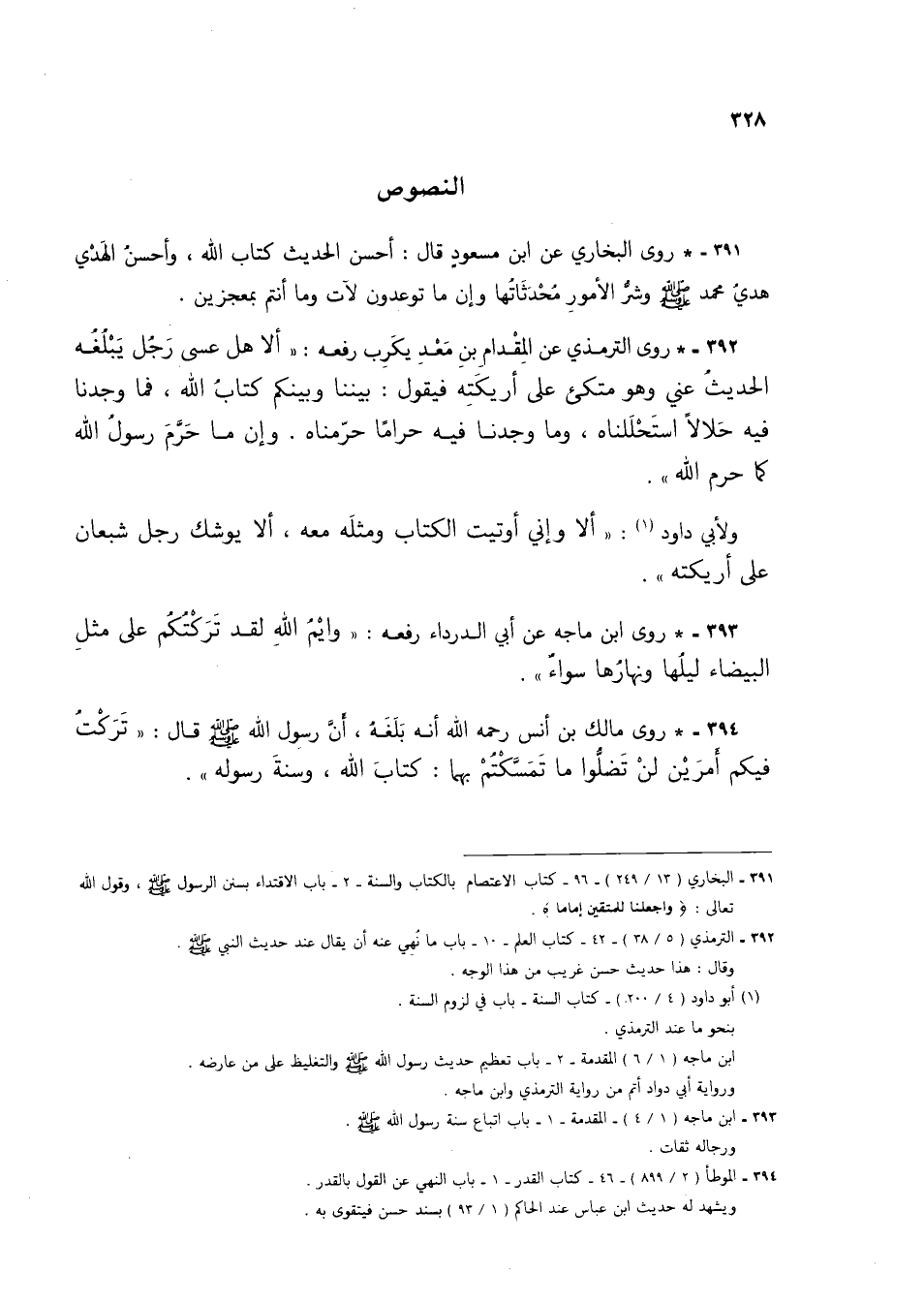 392 - * روى الترمذي عن المقدام بن معد يكرب رفعه: "ألا هل عسى رجل يبلغه الحديث عني وهو متكئ على أريكته فيقول: بيننا وبينكم كتابُ الله، فما وجدنا فيه حلالاً استحللناه، وما وجدنا فيه حراماً حرمناه. وإن ما حرَّم رسول الله كما حرم الله".