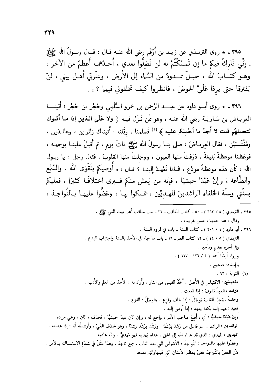 396 - * روى أبو داود عن عبد الرحمن بن عمرو السُّلمي وحُجر بن حُجر؛ أتينا العرباض بن سارية رضي الله عنه، وهو ممن نزل فيه {وَلَا عَلَى الَّذِينَ إِذَا مَا أَتَوْكَ لِتَحْمِلَهُمْ قُلْتَ لَا أَجِدُ مَا أَحْمِلُكُمْ عَلَيْهِ} (3) فسلمنا، وقُلنا: أتيناك زائرين، وعائدين، ومقتبسين، فقال العِرباض: صلى بنا رسول الله صلى الله عليه وسلم ذات يومٍ، ثم أقبل علينا بوجهه، فوعظنا موعظةً بليغةً، ذرفت منها العيون، ووجِلت منها القلوب، فقال رجل: يا رسول الله، كأن هذه موعظةٌ مودع، فماذا تعهدُ إلينا؟ قال: "أوصيكم بتقوى الله. والسمع والطاعة، وإن عبداً حبشياً، فإنه من يعش منكم فسيري اختلافاً كثيراً، فعليكم بسنتي وسنة الخلفاء الراشدين المهديين، تمسكوا بها، وعضُّوا عليها بالنواجذ،