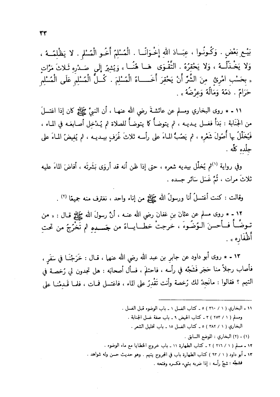 13 - أبو داود (1/ 93) كتاب الطهارة باب في المجروح يتيم. وهو حديث حسن وله شواهد.