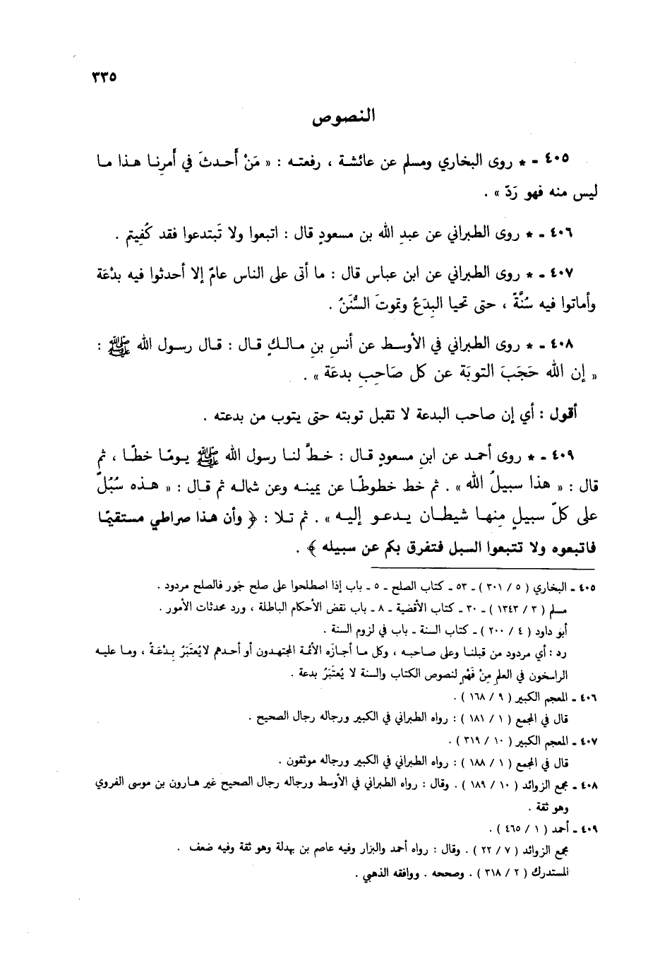 406 - * روى الطبراني عن عبد الله بن مسعودٍ قال: اتبعوا ولا تبتدعوا فقد كُفيتم.