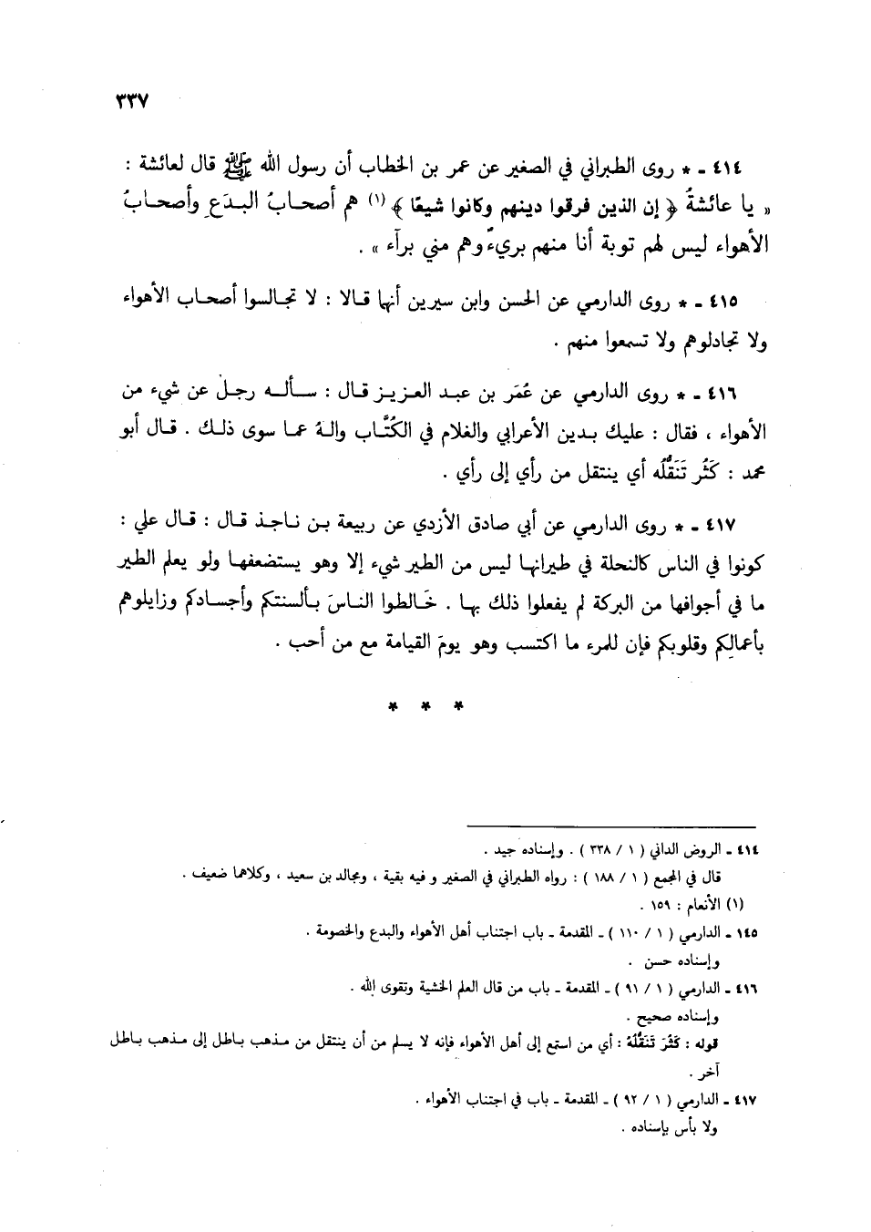 416 - * روى الدارمي عن عُمر بن عبد العزيز قال: سأله رجل عن شيء من الأهواء، فقال: عليك بدين الأعرابي والغلام في الكُتَّاب والهُ عما سوى ذلك. قال أبو محمد: كَثُر تنقله أي ينتقل من رأي إلى رأي.