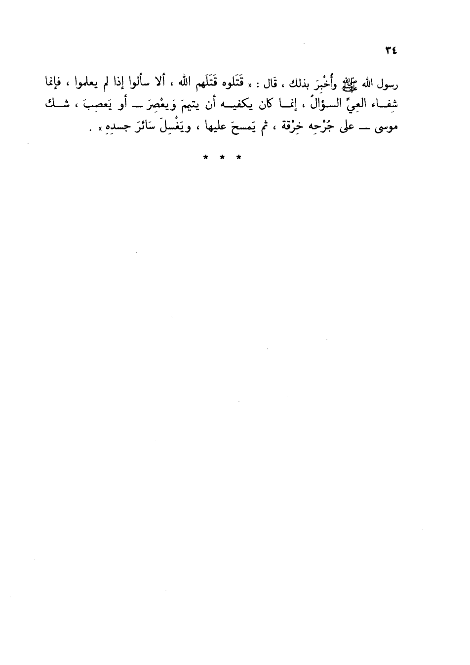 رسول الله صلى الله عليه وسلم وأخبر بذلك، قال: "قتلوه قتلهم الله، ألا سألوا إذا لم يعلموا، فإنما شفاء العيِّ السؤال، إنما كان يكفيه أن يتيمم ويعصر- أو يعصب، شك موسى- على جرحه خرقة، ثم يمسح عليها، ويغسل سائر جسده".