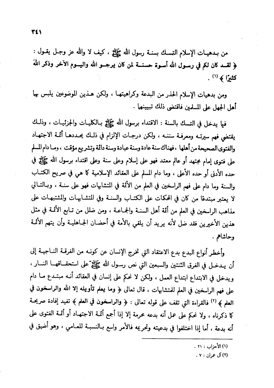 فيما يدخل في التمسك بالسنة: الاقتداء برسول الله صلى الله عليه وسلم بالكليات والجزئيات، وذلك يقتضي فهم سيرته ومعرفة سننه، ولكن درجات الإلزام في ذلك يحددها أئمة الاجتهاد والفتوى الصحيحة من أهلها، فهناك سنة عادة وسنة عبادة وسنة دائمة وتشريع مؤقت، وما دام المسلم على فتوى إمام مجتهد أو عالم معتمد فهو على إسلام وعلى سنة وعلى اقتداء برسول الله صلى الله عليه وسلم في حده الأدنى أو حده الأعلى، وما دام المسلم على العقائد الإسلامية كما هي في صريح الكتاب والسنة وما دام على فهم الراسخين في العلم من الأئمة في المتشابهات فهو على سنة، وبالتالي لا يعتبر مبتدعاً من من كان في المحكمات على الكتاب والسنة وفي المتشابهات والمشتبهات على مذاهب الراسخين في العلم من أئمة أهل السنة والجماعة، ومن ضلل من تابع الأئمة في مثل هذين الأخيرين فقد ضل لأنه يريد أن يلقي بالأمة في أحضان الجاهلية وأن يتهم الأئمة وحاشاهم.