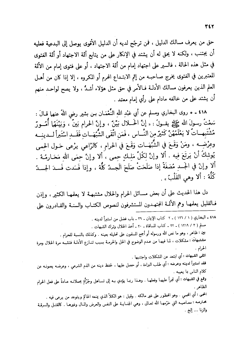 418 - * روى البخاري ومسلم عن أبي عبد الله النعمان بن بشير رضي الله عنهما قال: سمعت رسول الله صلى الله عليه وسلم يقول: "إن الحلال بيِّن، وإن الحرام بينٌ وبينهما أمورٌ مشتبهاتٌ لا يعلمهن كثيرٌ من الناس، فمن اتقى الشبهات فقد استبرأ لدينه وعِرضه، ومن وقع في الشبهات وقع في الحرام، كالراعي يرعى حول الحمى يُوشكُ أن يرتع فيه. ألا وإن لكلِّ ملكٍ حمى، ألا وإن حمى الله محارمُهُ. ألا وإن في الجسد مُضغةً إذا صلحت صلح الجسدُ كله، وإذا فسدت فسد الجسد كله: ألا وهي القلب".