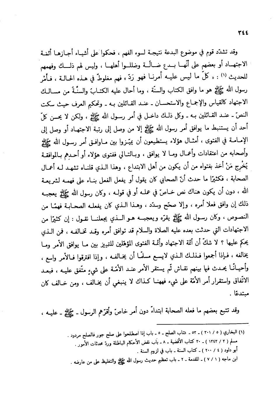 وقد تشدد قوم في موضوع البدعة نتيجة لسوء الفهم، فحكموا على أشياء أجازها أئمة الاجتهاد أو بعضهم على أنها بدع ضالة وضللوا أهلها، وليس لهم ذلك وفهمهمن للحديث (1): "كلُ ما ليس عليه أمرنا فهو رد" فهو مغلوطٌ في هذه الحالة، فأمر رسول الله صلى الله عليه وسلم هو ما وافق الكتاب والسنة، وما أحال عليه الكتاب والسنة من مسالك الاجتهاد كالقياس والإجماع والاستحسان -عند القائلين به- وتحكيم العرف حيث سكت النص- عند القائلين به- وكل ذلك داخل في أمر رسول الله صلى الله عليه وسلم، ولكن لا يحسن كل أحد أن يستنبط ما يوافق أمر رسول الله صلى الله عليه وسلم إلا من وصل إلى رتبة الاجتهاد أو وصل إلى الإمامة في الفتوى، أمثال هؤلاء يستطيعون أن يميزوا بين ما وافق أمر رسول الله صلى الله عليه وسلم وأصحابه من اعتقادات وأعمال وما لا يوافق، وبالتالي ففتوى هؤلاء أو أحدهم بالموافقة يُخرِج من أخذ بفتواه من أن يكون من أهل الابتداع، وهذا الذي قلناه تشهد له أعمال الصاحبة، فكثيراً ما حدث أن الصحابي كان يقول أو يفعل الفعل بناء على فهمه لشريعة الله، دون أن يكون هناك نص خاصٌ في عمله أو في قوله، وكان رسول الله صلى الله عليه وسلم يعجبه ذلك إن وافق فعلاً أمره، وإلا صحح وسدد، وهذا الذي كان يفعله الصحابة فهماً من النصوص، وكان رسول الله صلى الله عليه وسلم يقرّه ويعجبه هو الذي يجعلنا نقول: إن كثيراً من الاجتهادات التي حدثت بعده عليه الصلاة والسلام قد توافق أمره وقد تخالفه، فمن الذي يحكم عليها؟ لا شك أن أئمة الاجتهاد وأئمة الفتوى المؤهلين للتمييز بين ما يوافق الأمر وما يخالفه، فإذا أجمعوا فذلك الذي لا يسع مسلماً أن يخالفه، وإذا افترقوا فالأمر واسع، وأحياناً يحدث فيما بينهم نقاش ثم يستقر عند الأمة على شيءٍ متفق عليه، فبعد الاتفاق واستقرار أمر الأمة على شيء فههنا كذاك لا ينبغي أن يخالف، ومن خالف كان مبتدعاً.