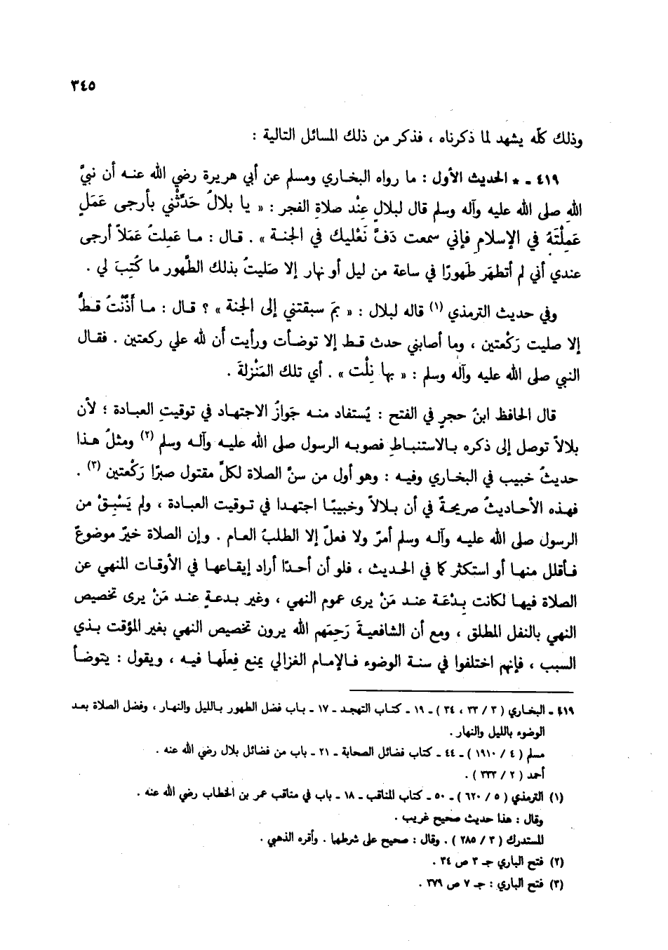 قال الحافظ ابن حجرٍ في الفتح: يُستفاد منه جوازُ الاجتهاد في توقيتِ العبادة؛ لأن بلالاً توصل إلى ذكره بالاستنباط فصوبه الرسول صلى الله عليه وآله وسلم (3) ومثلُ هذا حديثُ خبيب في البخاري وفيه: وهو أول من سن الصلاة لكلِّ مقتول صبراً ركعتين (4). فهذه الأحاديث صريحةً في أن بلالاً وخبيباً اجتهدا في توقيت العبادة، ولم يسبق من الرسول صلى الله عليه وآله وسلم أمرٌ ولا فعلٌ إلا الطلبُ العام. وإن الصلاة خيرٌ موضوعٌ فأقلل منها أو استكثر كما في الحديث، فلو أن أحداً أراد إيقاعها في الأوقات المنهي عن الصلاة فيها لكانت بدعة عند من يرى عمووم النهي، وغير بدعةٍ عند من يرى تخصيص النهي بالنفل المطلق، ومع أن الشافعية رحمهم الله يرون تخصيص النهي بغير المؤقت بذي السبب، فإنهم اختلفوا في سنة الوضوء فالإمام الغزالي يمنع فِعلها فيه، ويقول: يتوضأ