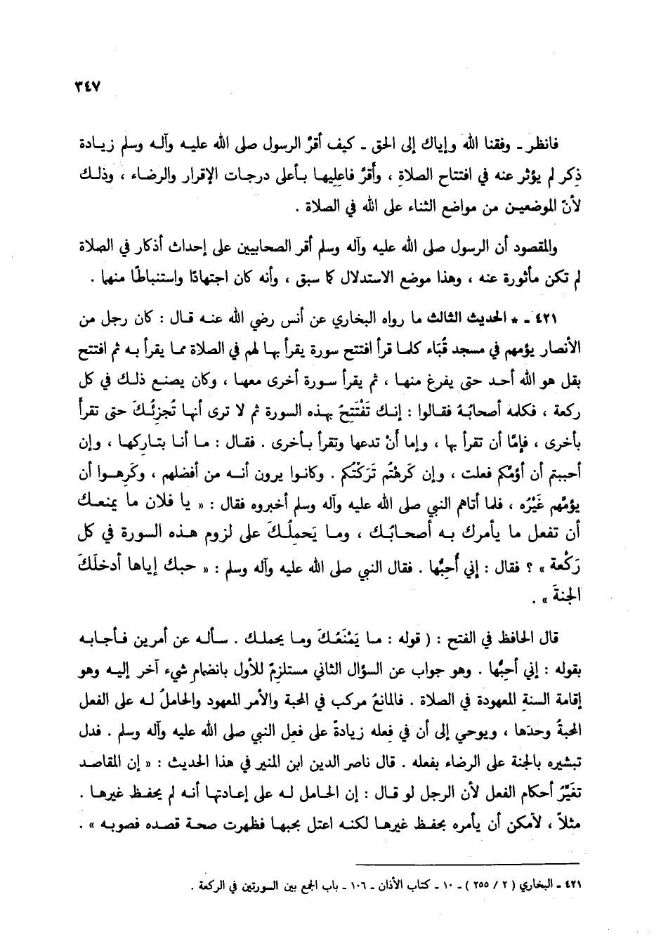 421 - * الحديث الثالث ما رواه البخاري عن أنس رضي الله عنه قال: كان رجل من الأنصار يؤمهم في مسجد قُباء كلما قرأ افتتح سورة يقرأ بها لهم في الصلاة مما يقرأ به ثم افتتح بقل هو الله أحد حتى يفرغ منها، ثم يقرأ سورة أخرى معها، وكان يصنع ذلك في كل ركعة، فكلمة أصحابهُ فقالوا: إنك تفتتحُ بهذه السورة ثم لا ترى أنها تُجزئُكَ حتى تقرأ بأخرى، فإما أن تقرأ بها، وإما أن تدعها وتقرأ بأخرى. فقال: ما أنا بتاركها، وإن أحببتم أن أؤمكم فعلت، وإن كرهتم تركتكم. وكانوا يرون أنه من أفضلهم، وكرهوا أن يؤمهم غيره، فلما أتاهم النبي صلى الله عليه وآله وسلم أخبروه فقال: "يا فلان ما يمنعك أن تفعل ما يأمرك به أصحابك، وما يحملك على لزوم هذه السورة في كل ركعة"؟ فقال: إني أحبها. فقال النبي صلى الله عليه وآله وسلم: "حبك إياها أدخلك الجنة".