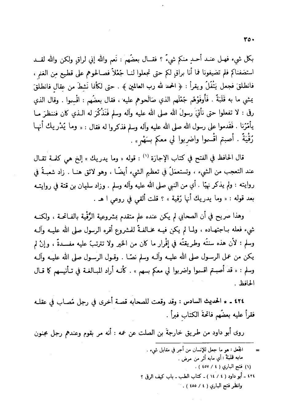 424 - * الحديث السادس: وقد وقعت للصحابة قصة أخرى في رجل مُصاب في عقله فقرأ عليه بعضُهم فاتحةَ الكتابِ فبرأ.