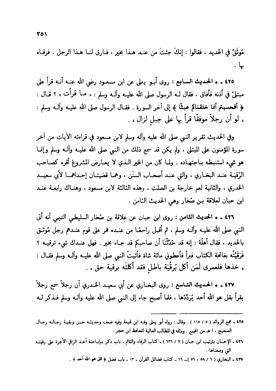 427 - * الحديث التاسع: روى البخاري عن أبي سعيد الخدري أن رجلًا سمع رجلًا يقرأ بقل هو الله أحد يرددها، فلما أصبح جاء إلى النبي صلى الله عليه وآله وسلم فذكر له