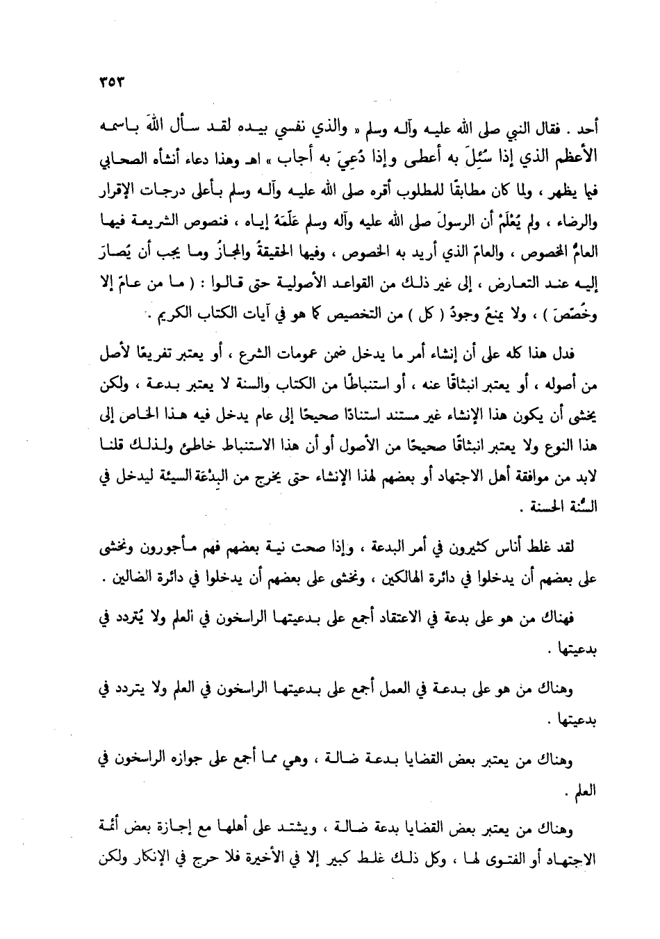 فدل هذا كله على أن إنشاء أمر ما يدخل ضمن عمومات الشرع، أو يعتبر تفريعًا لأصل من أصوله، أو يعتبر انبثاقًا عنه، أو استنباطًا من الكتاب والسنة لا يعتبر بدعة، ولكن يخشى أن يكون هذا الإنشاء غير مستند استنادًا صحيحًا إلى عام يدخل فيه هذا الخاص إلى هذا النوع ولا يعتبر انبثاقًا صحيحًا من الأصول أو أن هذا الاستنباط خاطئ ولذلك قلنا لابد من موافقة أهل الاجتهاد أو بعضهم لهذا الإنشاء حتى يخرج من البدعة السيئة ليدخل في السنة الحسنة.