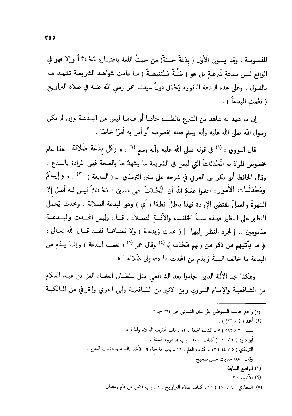 المذمومة. وقد يسمون الأول (بدعة حسنة) من حيث اللغة باعتباره محدثًا وإلا فهو في الواقع ليس ببدعة شرعية بل هو (سنة مستنبطة) ما دامت شواهد الشريعة تشهد لها بالقبول. وعلى هذه البدعة اللغوية يحمل قول سيدنا عمر رضي الله عنه في صلاة التراويح (نعمت البدعة).
