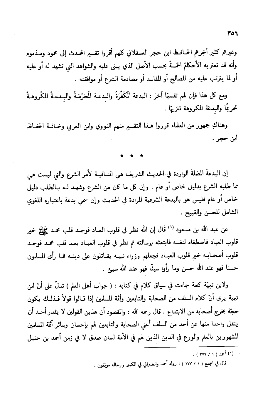 وغيرهم كثير آخرهم الحافظ ابن حجر العسقلاني كلهم أقروا تقسيم المحدث إلى محمود ومذموم وأنه قد تعتريه الأحكام الخمسة بحسب الأصل الذي يبنى عليه والشواهد التي تشهد له أو عليه أو لما يترتب عليه من المصالح أو المفاسد أو مصادمة الشرع أو موافقته.