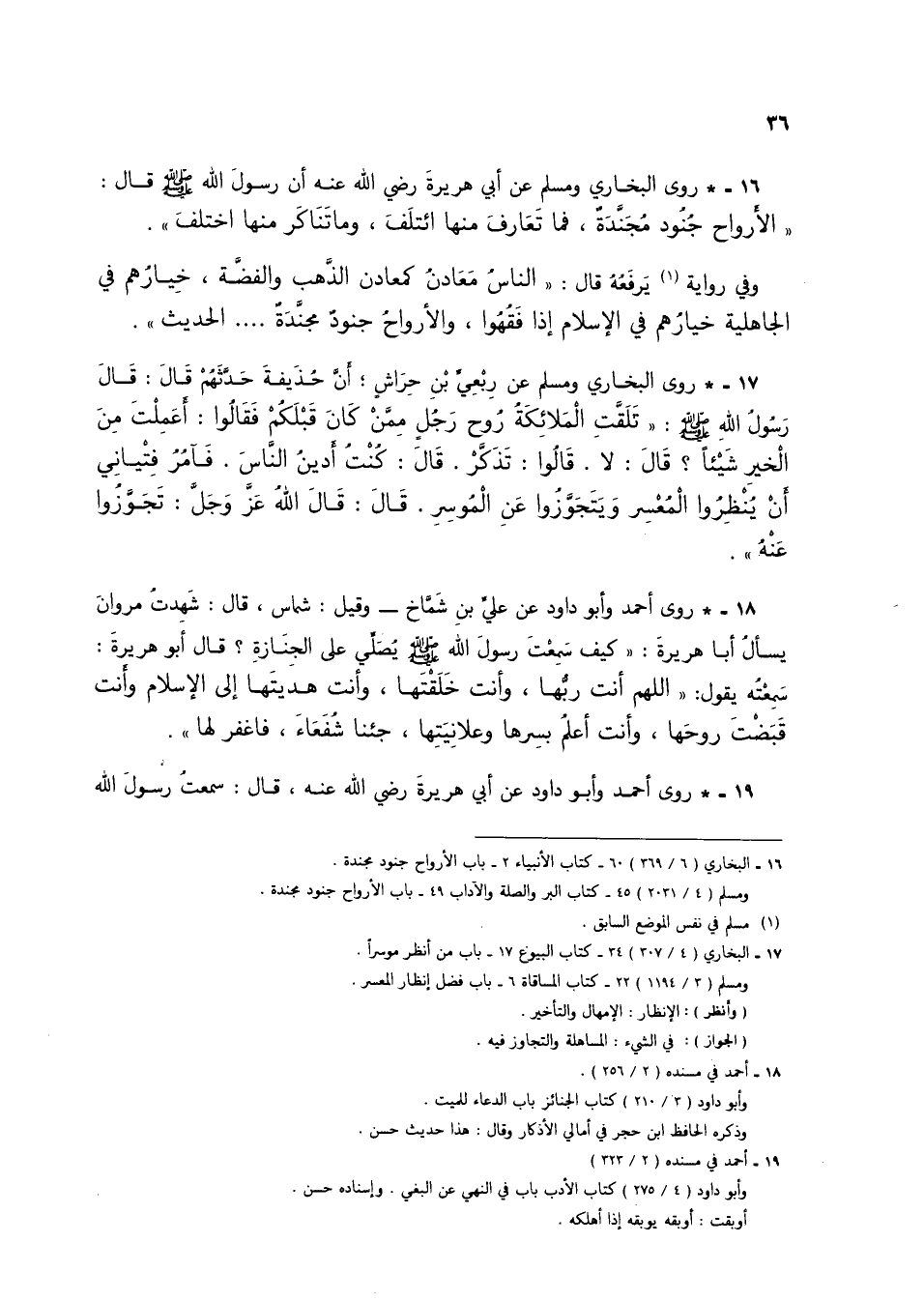 16 - * روى البخاري ومسلم عن أبي هريرة رضي الله عنه أن رسول الله صلى الله عليه وسلم قال: "الأرواح جنود مجندة، فما تعارف منها ائتلف، وما تناكر منها اختلف".