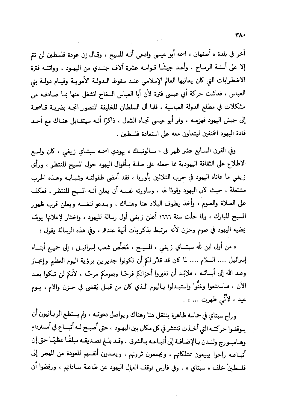 آخر في بلدة "أصفهان" اسمه أبو عيسى وادعى أنه المسيح، وقال إن عودة فلسطين لن تتم إلا على أسنة الرماح، وأعد جيشًا قوامه عشرة آلاف جندي من اليهود، وواتته فترة الاضطرابات التي كان يعانيها العالم الإسلامي عند سقوط الدولة الأموية وقيام دولة بني العباس، فعاشت حركة أبي عيسى فترة لأن أبا العباس السفاح انشغل عنها بما صادفه من مشكلات في مطلع الدولة العباسية، فلما آل السلطان للخليفة المنصور اتجه بضربة قاصمة إلى جيش اليهود فهزمه، وفر أبو عيسى تجاه الشمال، ذاكرًا أنه سيتقابل هناك مع أحد قادة اليهود المختفين ليتعاون معه على استعادة فلسطين.