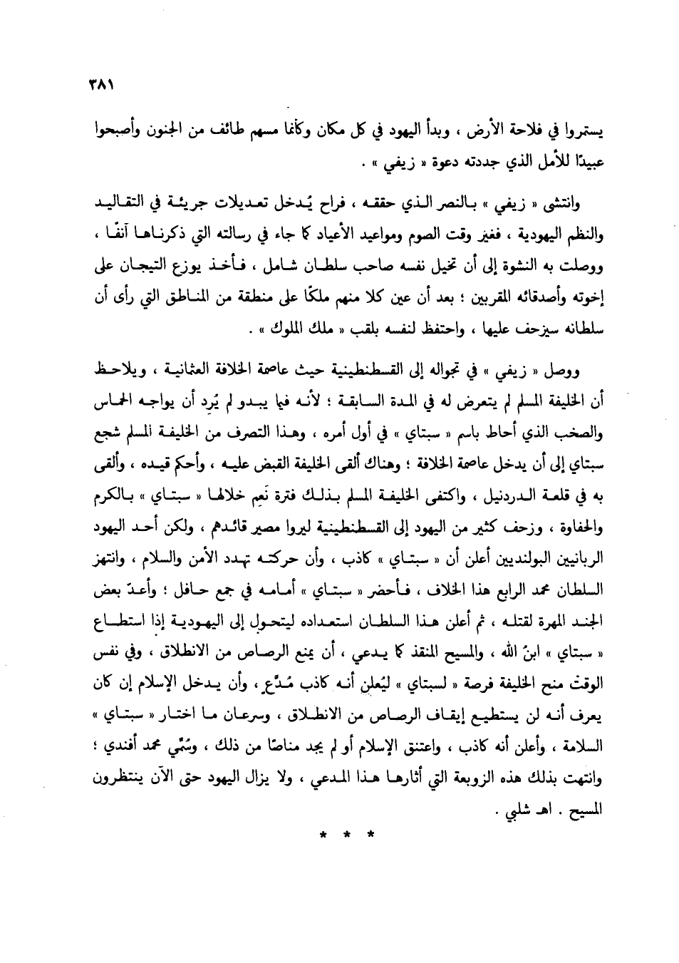 ووصل "زيفي" في تجواله إلى القسطنطينية حيث عاصمة الخلافة العثماينة، ويلاحظ أن الخليفة المسلم لم يتعرض له في المدة السابقة؛ لأنه فيما يبدو لم يُرد أن يواجه الحماس والصخب الذي أحاط باسم "سبتاي" في أول أمره، وهذا التصرف من الخليفة المسلم شجع سبتاي إلى أن يدخل عاصمة الخلافة؛ وهناك ألقى الخليفة القبض عليه، وأحكم قيده، وألقى به في قلعة الدردنيل، واكتفى الخليفة المسلم بذلك فترة نعم خلالها "سبتاي" بالكرم والحفاوة، وزحف كثير من اليهود إلى القسطنطينية ليروا مصير قائدهم، ولكن أحد اليهود الربانيين البولنديين أعلن أن "سبتاي" كاذب، وأن حركته تهدد الأمن والسلام، وانتهز السلطان محمد الرابع هذا الخلاف، فأحضر "سبتاي" أمامه في جمع حافل؛ وأعدّ بعض الجند المهرة لقتله، ثم أعلن هذا السلطان استعداده ليتحول إلى اليهودية إذا استطاع "سبتاي" ابنُ الله، والمسيح المنقذ كما يدعي، أن يمنع الرصاص من الانطلاق، وفي نفس الوقت منح الخلفية فرصة "لسبتاي" ليُعلن أنه كاذب مُدَّعٍ، وأن يدخل الإسلام إن كان يعرف أنه لن يستطيع إيقاف الرصاص من الانطلاق، وسرعان ما اختار "سبتاي" السلامة، وأعلن أنه كاذب، واعتنق الإسلام أو لم يجد مناصاً من ذلك، وسُمِّي محمد أفندي؛ وانتهت بذلك هذه الزوبعة التي أثارها هذا المدعي، ولا يزال اليهود حتى الآن ينتظرون المسيح. اهـ شلبي.