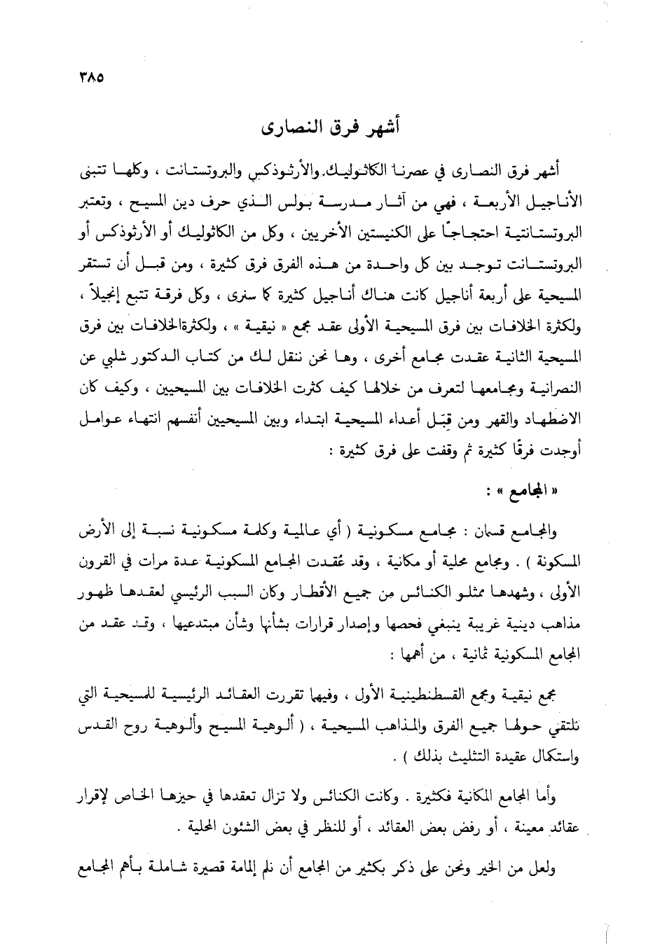 أشهر فرق النصارى في عصرنا الكاثوليك والأرثوذكس والبروتستانت، وكلها تتبنى الأناجيل الأربعة، فهي من آثار مدرسة بولس الذي حرف دين المسيح، وتعتبر البروتستانتية احتجاجاً على الكنيستين الأخريين، وكل من الكاثوليك أو الأرثوذكس أو البروتستانت توجد بين كل واحدة من هذه الفرق فرق كثيرة، ومن قبل أن تستقر المسيحية على أربعة أناجيل كانت هناك أناجيل كثيرة كما سنرى، وكل فرقة تتبع إنجيلاً، ولكثرة الخلافات بين فرق المسيحية الأولى عقد مجمع "نيقية"، ولكثرة الخلافات بين فرق المسيحية الثانية عقدت مجامع أخرى، وها نحن ننقل لك من كتاب الدكتور شلبي عن النصرانية ومجامعها لتعرف من خلالها كيف كثرت الخلافات بين المسيحيين، وكيف كان الاضطهاد والقهر ومن قبل أعداء المسيحية ابتداء وبين المسيحيين أنفسهم انتهاء عوامل أوجدت فرقاً كثيرة ثم وقفت على فرق كثيرة: