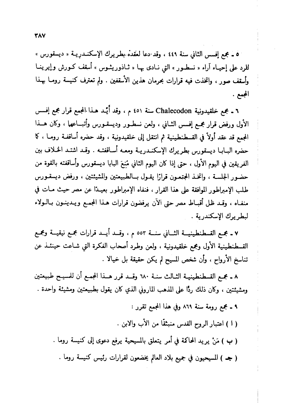 8 - مجمع القسطنطينية الثالث سنة 680 وقد قرر هذا المجمع أن للمسيح طبيعتين ومشيئتين، وكان ذلك رداً على المذهب الماروني الذي كان يقول بطبيعتين ومشيئة واحدة.