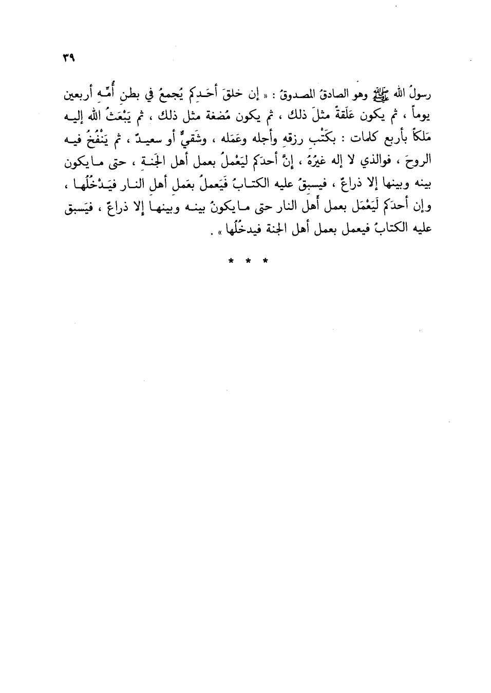 رسول الله صلى الله عليه وسلم وهو الصادق المصدوق: "إن خلق أحدكم يجمعُ في بطن أمه أربعين يوماً، ثم يكون علقةً مثل ذلك، ثم يكون مُضغة مثل ذلك، ثم يبعث الله إليه ملكاً بأربع كلمات: بكتب رزقه وأجله وعمله، وشقيٌّ أو سعيدٌ، ثم ينفخ فيه الروح، فوالذي لا إله غيرهُ، إن أحدكم ليعمل بعمل أهل الجنة، حتى ما يكون بينه وبينها إلا ذراعٌ، فيسبق عليه الكتاب فيعمل بعمل أهل النار فيدخلها، وإن أحدكم ليعمل بعمل أهل النار حتى ما يكون بينه وبينها إلا ذراعٌ، فيسبق عليه الكتابُ فيعمل بعمل أهل الجنة فيدخُلُها".