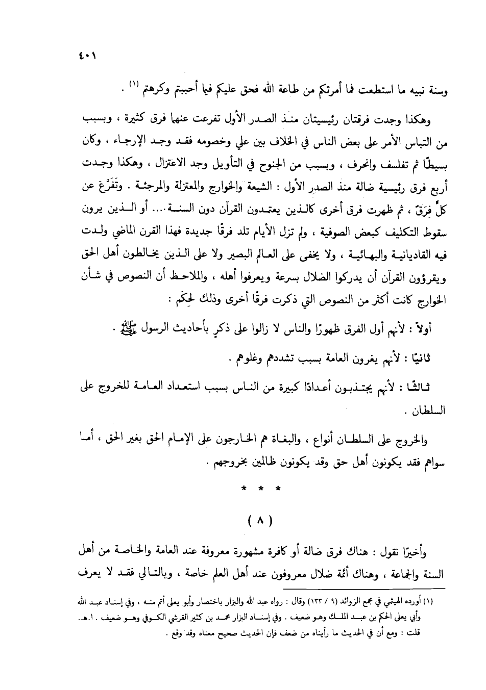 وهكذا وجدت فرقتان رئيسيتان منذ الصدر الأول تفرعت عنهما فرق كثيرة، وبسبب من التباس الأمر على بعض الناس في الخلاف بين علي وخصومه فقد وجد الإرجاء، وكان بسيطًا ثم تفلسف وانحرف، وبسبب من الجنوح في التأويل وجد الاعتزال، وهكذا وجدت أربع فرق رئيسية ضالة منذ الصدر الأول: الشيعة والخوارج والمعتزلة والمرجئة. وتفرع عن كل فرق، ثم ظهرت فرق أخرى كالذين يعتمدون القرآن دون السنة ... أو الذين يرون سقوط التكاليف كبعض الصوفية، ولم تزل الأيام تلد فرقًا جديدة فهذا القرن الماضي ولدت فيه القاديانية والبهائية، ولا يخفى على العالم البصير ولا على الذين يخالطون أهل الحق ويقرؤون القرآن أن يدكوا الضلال بسرعة ويعرفوا أهله، والملاحظ أن النصوص في شأن الخوارج كانت أكثر من النصوص التي ذكرت فرقًا أخرى وذلك لحكم: