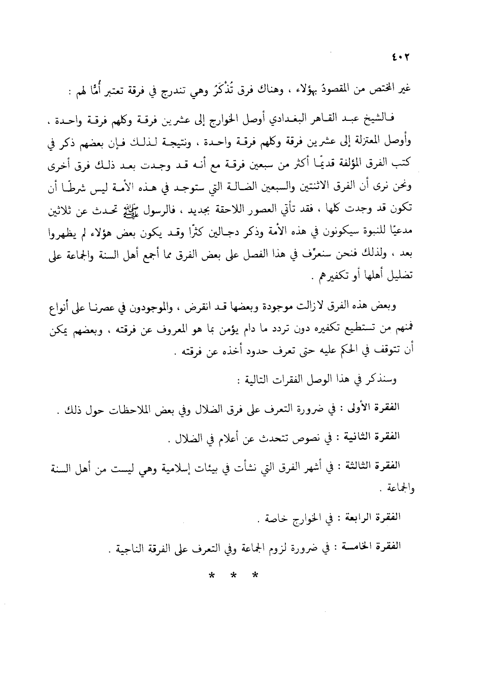 فالشيخ عبد القاهرة البغدادي أوصل الخوارج إلى عشرين فرقة وكلهم فرقة واحدة، وأوصل المعتزلة إلى عشرين فرقة وكلهم فرقة واحدة، ونتيجة لذلك فإن بعضم ذكر في كتب الفرق المؤلفة قديمًا أكثر من سبعين فرقة مع أنه قد وجدت بعد ذلك فرق أخرى ونحن نرى أن الفرق الاثنتين والسبعين الضالة التي ستوجد في هذه الأمة ليس شرطًا أن تكون قد وجدت كلها، فقد تأتي العصور اللاحقة بجديد، فالرسول صلى الله عليه وسلم تحدث عن ثلاثين مدعيًا للنبوة سيكونون في هذه الأمة وذكر دجالين كثرًا وقد يكون بعض هؤلاء لم يظهروا بعد، ولذلك فنحن سنعرف في هذا الفصل على بعض الفرق مما أجمع أهل السنة والجماعة على تضليل أهلها أو تكفيرهم.