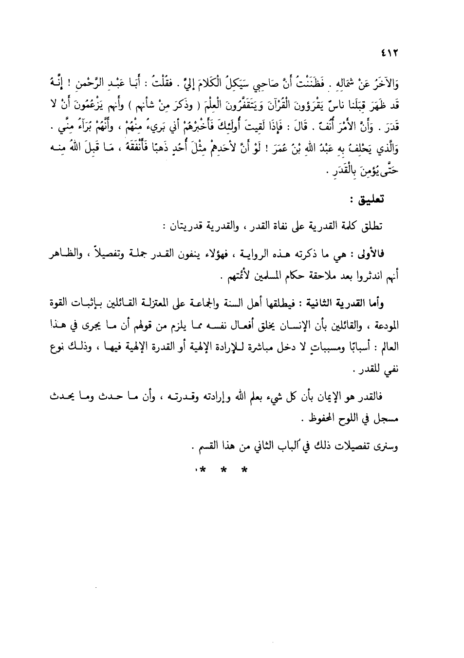 فالأولى: هي ما ذكرته هذه الرواية، فهؤلاء ينفون القدر جملة وتفصيلاً، والظاهر أنهم اندثروا بعد ملاحقة حكام المسلمين لأئمتهم.