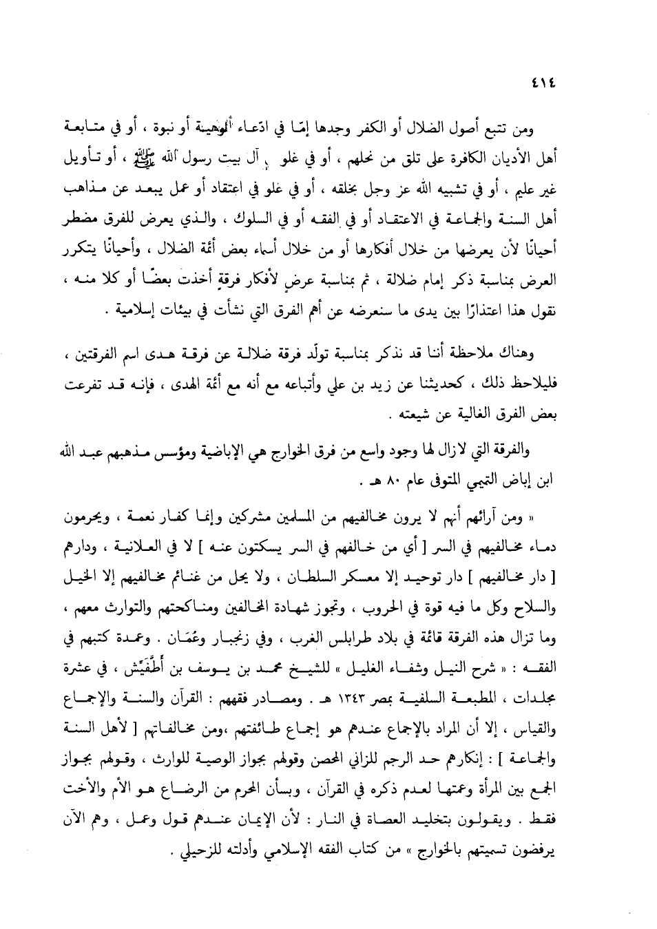"من آرائهم أنهم لا يرون مخالفيهم من المسلمين مشركين وإنما كفار نعمة، ويحرمون دماء مخالفيهم في السر [أي من خالفهم في السر يسكتون عنه] لا في العلانية، ودارهم [دار مخالفيهم] دار توحيد إلام معسكر السلطان ولا يحل من غنائم مخالفيهم إلا الخيل والسلاح وكل ما فيه قوة في الحروب، وتجوز شهادة المخالفين ومناكحتهم والتوارث معهم، وما تزال هذه الفرقة قائمة في بلاد طرابلس الغرب، وفي زنجيار وعمان. وعمدة كتبهم في الفقه: "شرح النيل وشفاء الغليل" للشيخ محمد بن يوسف بن أطفيش، في عشرة مجلدات، المطبعة السلفية بمصر 1343 هـ. ومصادر فقههم: القرآن والسنة والإجماع والقياس، إلا أن المراد بالإجماع عندهم هو إجماع طائفتهم، ومن مخالفاتهم [لأهل السنة والجماعة]: إنكارهم حد الرجم للزاني المحصن وقولهم بجواز الوصية للوارث، وقولهم بجواز الجمع بين المرأة وعمتها لعدم ذكره في القرآن، وبأن المحرم من الرضاع هو الأم والأخت فقط. ويقولون بتخليد العصاة في النار: لأن الإيمان عندهم قول وعمل، وهم الآن يرفضون تسميتهم بالخوارج" من كتاب الفقه الإسلامي وأدلته للزحيلي.