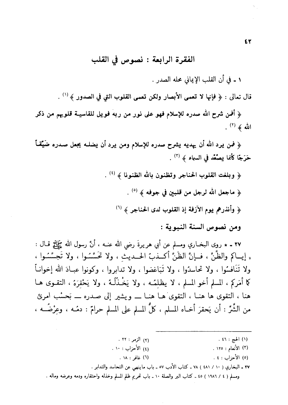 27 - * روى البخاري ومسلم عن أبي هريرة رضي الله عنه، أنَّ رسول الله صلى الله عليه وسلم قال: "إياكم والظنَّ، فإنَّ الظن أكذب الحديث، ولا تحسسوا، ولا تجسسوا، ولا تنافسوا، ولا تحاسدوا، ولا تباغضوا، ولا تدابروا، وكونوا عباد الله إخواناً كما أمركم، المسلم أخو المسلم، لا يظلمه، ولا يخذله، ولا يحقره، التقوى ها هنا، التقوى ها هنا، التقوى ها هنا- ويشير الي صدره- بحسب امرئ من الشَّرِّ: أن يحقر أخاه المسلم، كلُّ المسلم على المسلم حرامٌ: دمُه، وعرضُه،