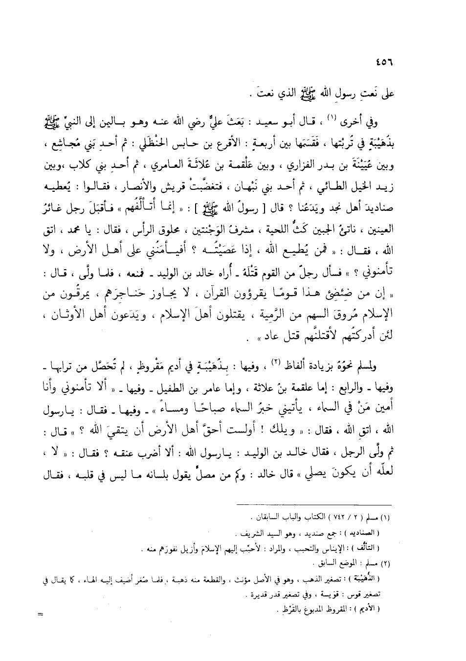 ولمسلم نحوه بزيادة ألفاظ (2)، وفيها: بذهيبة في أديم مقروظ، لم تحصل من ترابها- وفيها- والرابع: إما علقمة بن علاثة، وإما عامر بن الطفيل- وفيها- "ألا تأمنوني وأنا أمين من في السماء، يأتيني خبر السماء صباحًا ومساءً"- وفيها- فقال: يا رسول الله، اتق الله، فقال: "ويلك! أولست أحق أهل الأرض أن يتقي الله؟ " قال: ثم ولى الرجل، فقال خالد بن الوليد: يا رسول الله: ألا أضرب عنقه؟ فقال: "لا، لعله أن يكون يصلي" قال خالد: وكم من مصل يقول بلسانه ما ليس في قلبه، فقال