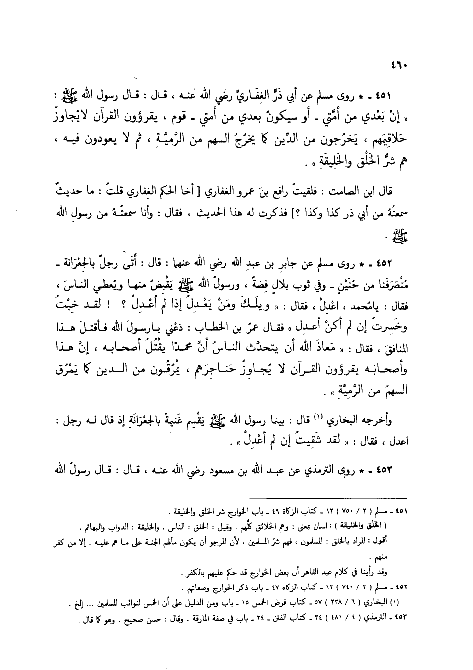 452 - * روى مسلم عن جابر بن عبد الله رضي الله عنهما: قال: أتى رجل بالجعرانة- منصرفنا من حنين- وفي ثوب بلال فضة، ورسول الله صلى الله عليه وسلم يقبض منها ويعطي الناس، فقال: يا محمد، اعدل، فقال: "ويلك ومن يعدل إذا لم أعدل؟! لقد خبت وخسرت إن لم أكن أعدل" فقال عمر بن الخطاب: دعني يا رسول الله فأقتل هذا المنافق، فقال: "معاذ الله أن يتحدث الناس أن محمدًا يقتل أصحابه، إن هذا وأصحابه يقرؤون القرآن لا يجاوز حناجرهم، يمرقون من الدين كما يمرق السهم من الرمية".
