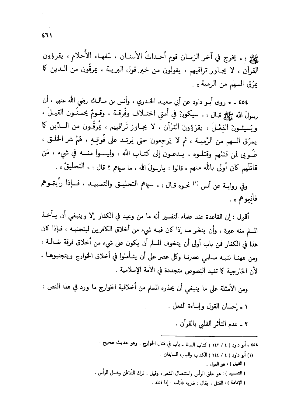 454 - * روى أبو داود عن أبي سعيد الخدري، وأنس بن مالك رضي الله عنهما، أن رسول الله صلى الله عليه وسلم قال؛ "سيكون في أمتي اختلاف وفرقة، وقوم يحسنون القيل، ويسيئون الفعل، يقرؤون القرآن، لا يجاوز تراقيهم، يمرقون من الدين كما يمرق السهم من الرمية، ثم لا يرجعون حتى يرتد على فوقه، هم شر الخلق، طوبى لمن قتلهم وقتلوه، يدعون إلى كتاب الله، وليسوا منه في شيء، من قاتلهم كان أولى بالله منهم" قالوا: يا رسول الله، ما سيماهم؟ قال: "التحليق".