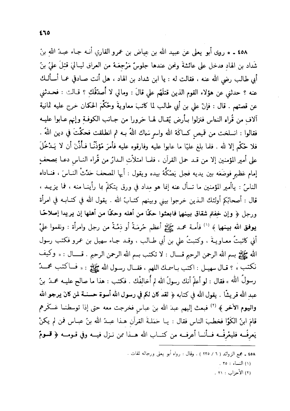 458 - * روى أبو يعلى عن عبيد الله بن عياض بن عمرو القاري أنه جاء عبد الله بن شداد بن الهاد فدخل على عائشة ونحن عندها جلوس مرجعه من العراق ليالي قتل علي بن أبي طالب رضي الله عنه، فقالت له: يا ابن شداد بن الهاد، هل أنت صادقي عما أسألك عنه؟ حدثني عن هؤلاء القوم الذين قتلهم علي قال: ومالي لا أصدقك؟ قالت: فحدثني عن قصتهم. قال: فإن علي بن أبي طالب لما كاتب معاوية وحكم الحكمان خرج عليه ثمانية آلاف من قراء الناس فنزلوا بأرض يقال لها حرورا من جانب الكوفة وإنهم عابوا عليه فقالوا: انسلخت من قميص كساكه الله واسم سماك الله به ثم انطلقت فحكمت في دين الله. فلا حكم إلا لله. فلما بلغ عليًا ما عابوا عليه وفارقوه عليه فأمر مؤذنا فأذن أن لا يدخل على أمير المؤمنين إلا من قد حمل القرآن، فلما امتلأت الدار من قراء الناس دعا بمصحف إمام عظيم فوضعه بين يديه فجعل يصكه بيده ويقول: أيها المصحف حدث الناس، فناداه الناس: يا أمير المؤمنين ما تسأل عنه إنما هو مداد في ورق يتكلم بما رأينا منه، فما يزيد، قال: أصحابكم أولئك الذين خرجوا بيني وبينهم كتاب الله. يقول الله في كتابه في امرأة ورجل {وَإِنْ خِفْتُمْ شِقَاقَ بَيْنِهِمَا فَابْعَثُوا حَكَمًا مِنْ أَهْلِهِ وَحَكَمًا مِنْ أَهْلِهَا إِنْ يُرِيدَا إِصْلَاحًا يُوَفِّقِ اللَّهُ بَيْنَهُمَا} (1) فأمة محمد صلى الله عليه وسلم أعظم حرمة أو ذمة من رجل وامرأة: ونقموا علي أني كاتبت معاوية، وكتبت علي بن أبي طالب، وقد جاء سهيل بن عمرو فكتب رسول الله صلى الله عليه وسلم بسم الله الرحمن الرحيم قال: لا تكتب بسم الله الرحمن الرحيم. قال: "وكيف نكتب"؟ قال سهيل: اكتب باسمك اللهم، فقال رسول الله صلى الله عليه وسلم: "فاكتب محمد رسول الله" فقال: لو أعلم أنك رسول الله لم أخالفك. فكتب: هذا ما صالح عليه محمد بن عبد الله قريشًا. يقول الله في كتابه {لَقَدْ كَانَ لَكُمْ فِي رَسُولِ اللَّهِ أُسْوَةٌ حَسَنَةٌ لِمَنْ كَانَ يَرْجُو اللَّهَ وَالْيَوْمَ الْآخِرَ} (2) فبعث إليهم عبد الله بن عباس فخرجت معه حتى إذا توسطنا عسكرهم قام ابن الكوا فخطب الناس فقال: يا حملة القرآن هذا عبد الله بن عباس فمن لم يكن يعرفه فليعرفه فأنا أعرفه من كتاب الله هذا ممن نزل فيه وفي قومه {قَوْمٌ