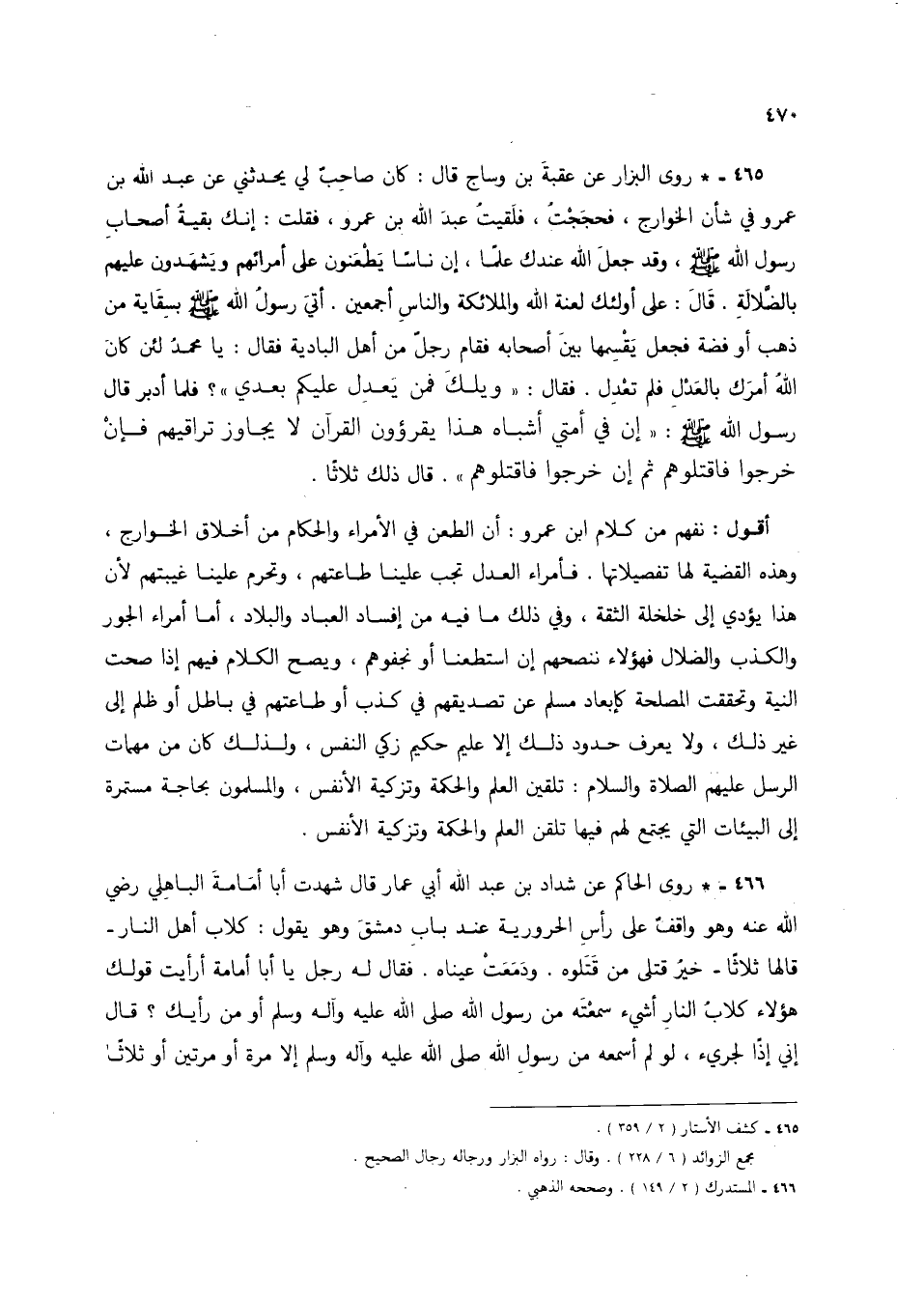 465 - * روى البزار عن عقبة بن وساج قال: كان صاحب لي يحدثني عن عبد الله بن عمرو في شأن الخوارج، فحججت، فلقيت عبد الله بن عمرو، فقلت: إنك بقية أصحاب رسول الله صلى الله عليه وسلم، وقد جعل الله عندك علمًا، إن ناسا يطعنون على أمرائهم ويشهدون عليهم بالضلالة. قال: على أولئك لعنة الله والملائكة والناس أجمعين. أتي رسول الله صلى الله عليه وسلم بسقاية من ذهب أو فضة فجعل يقسمها بين أصحابه فقام رجل من أهل البادية فقال: يا محمد لئن كان الله أمرك بالعدل فلم تعدل. فقال: "ويلك فمن يعدل عليكم بعدي"؟ فلما أدبر قال رسول الله صلى الله عليه وسلم: "إن في أمتي أشباه هذا يقرؤون القرآن لا يجاوز تراقيهم فإن خرجوا فاقتلوهم ثم إن خرجوا فاقتلوهم". قال ذلك ثلاثًا.